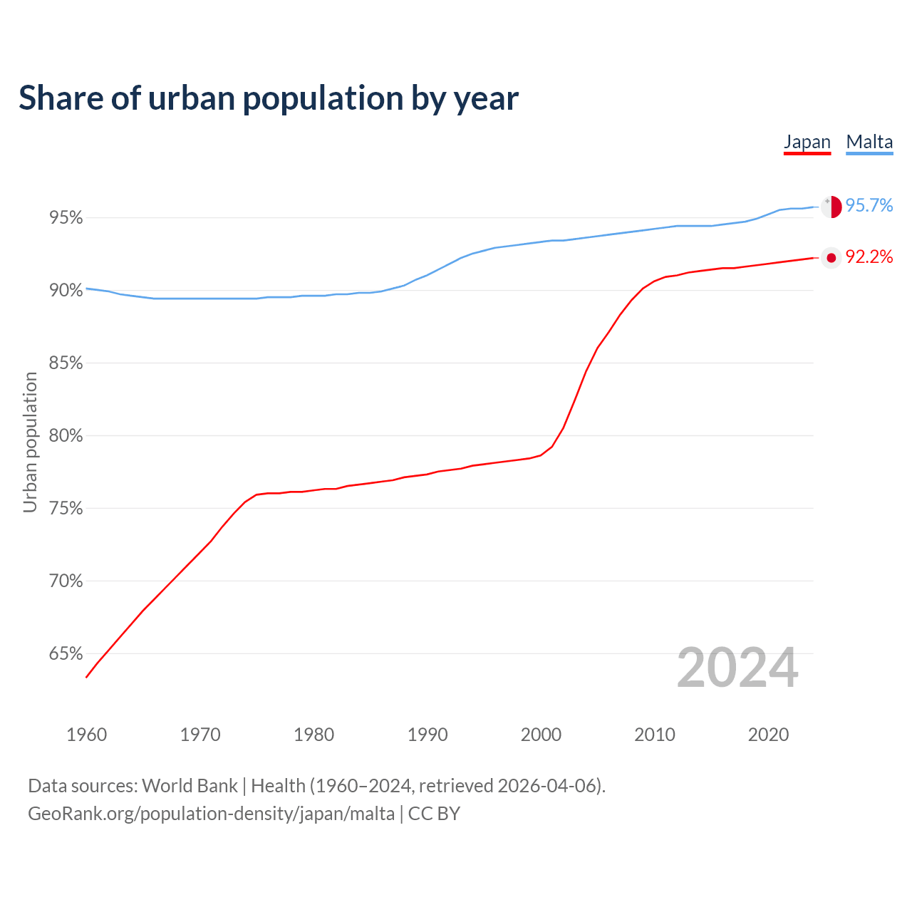 From 2004 to 2024, the share of urban population changed from 84.4% to 92.2% in Japan and from 93.6% to 95.7% in Malta.