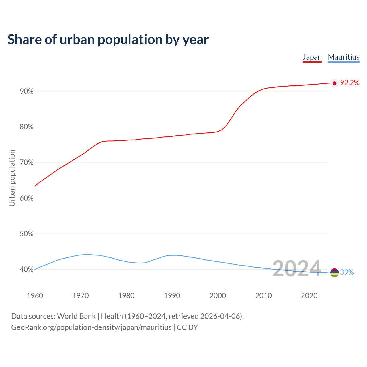 From 2004 to 2024, the share of urban population changed from 84.4% to 92.2% in Japan and from 41.3% to 39% in Mauritius.