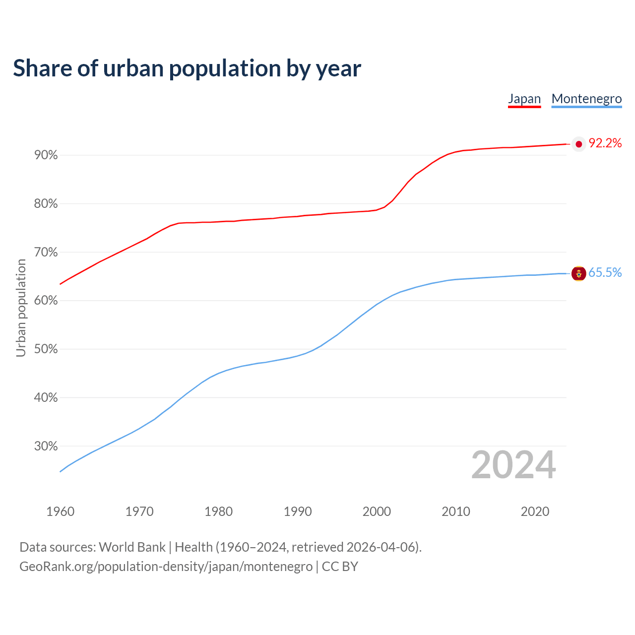 From 2004 to 2024, the share of urban population changed from 84.4% to 92.2% in Japan and from 62.2% to 65.5% in Montenegro.