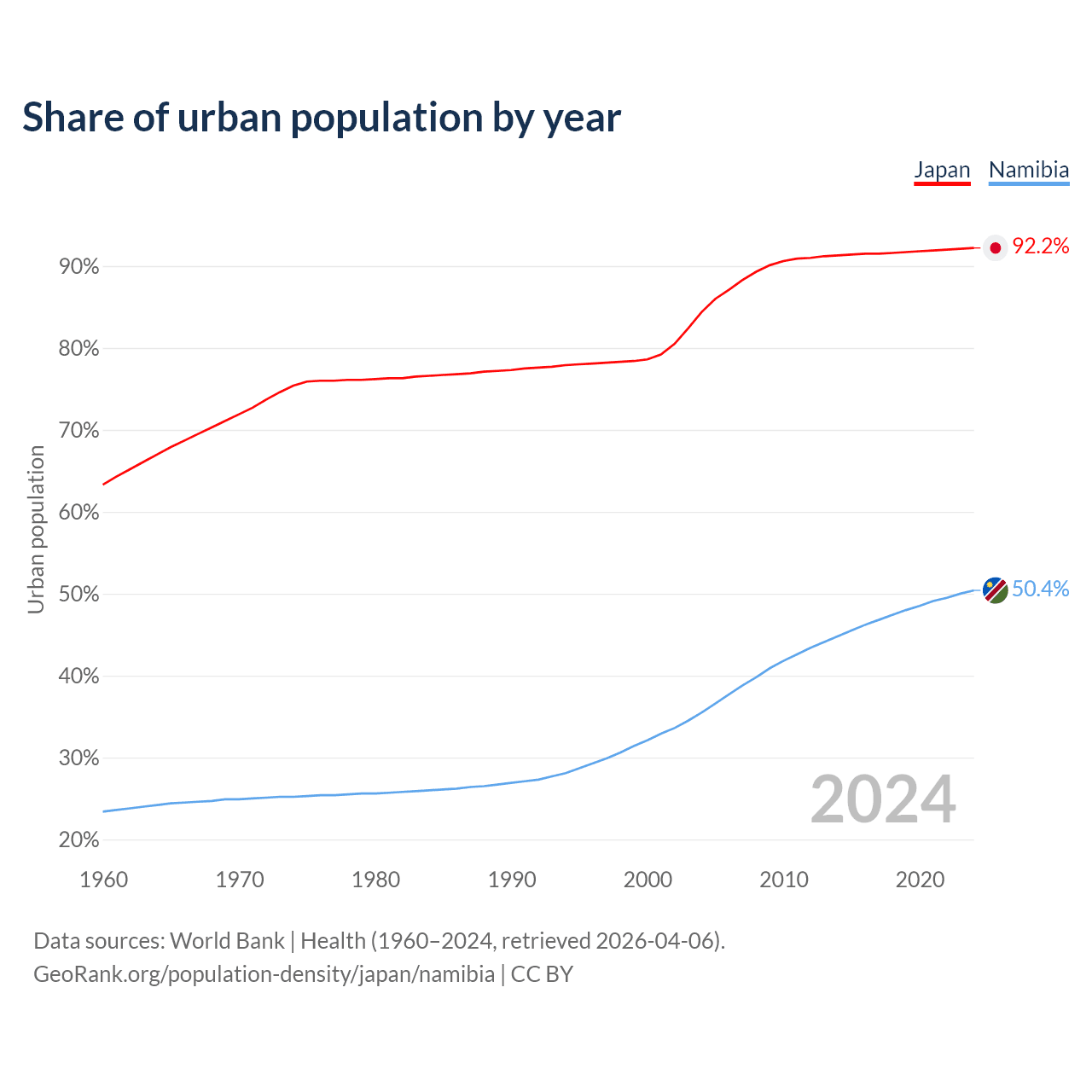 From 2004 to 2024, the share of urban population changed from 84.4% to 92.2% in Japan and from 35.5% to 50.4% in Namibia.