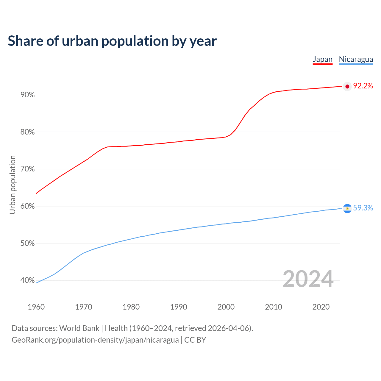 From 2004 to 2024, the share of urban population changed from 84.4% to 92.2% in Japan and from 55.8% to 59.3% in Nicaragua.