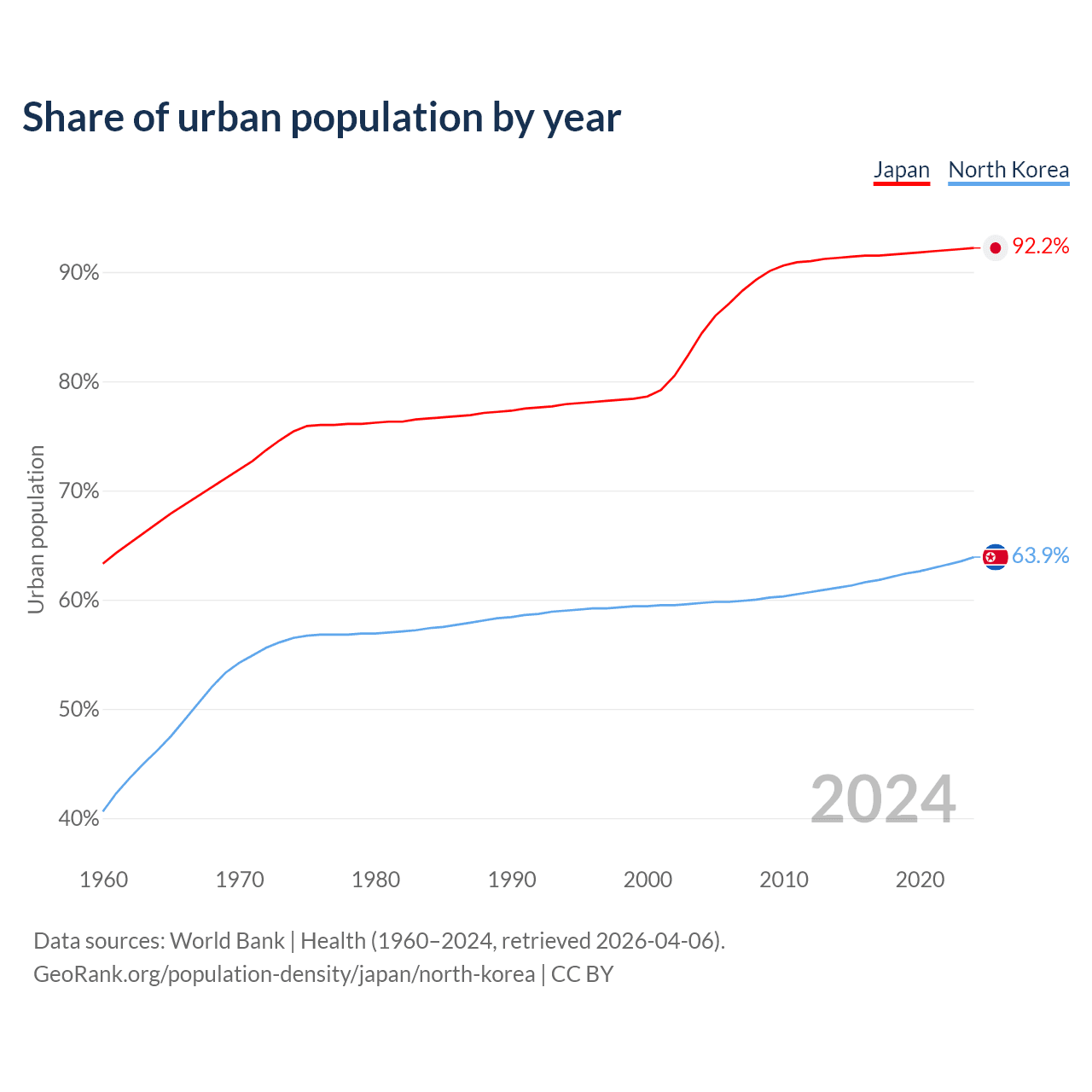 From 2004 to 2024, the share of urban population changed from 84.4% to 92.2% in Japan and from 59.7% to 63.9% in North Korea.