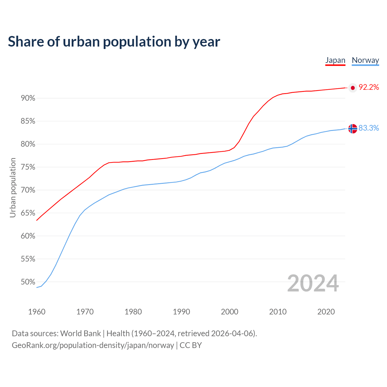 From 2004 to 2024, the share of urban population changed from 84.4% to 92.2% in Japan and from 77.6% to 83.3% in Norway.