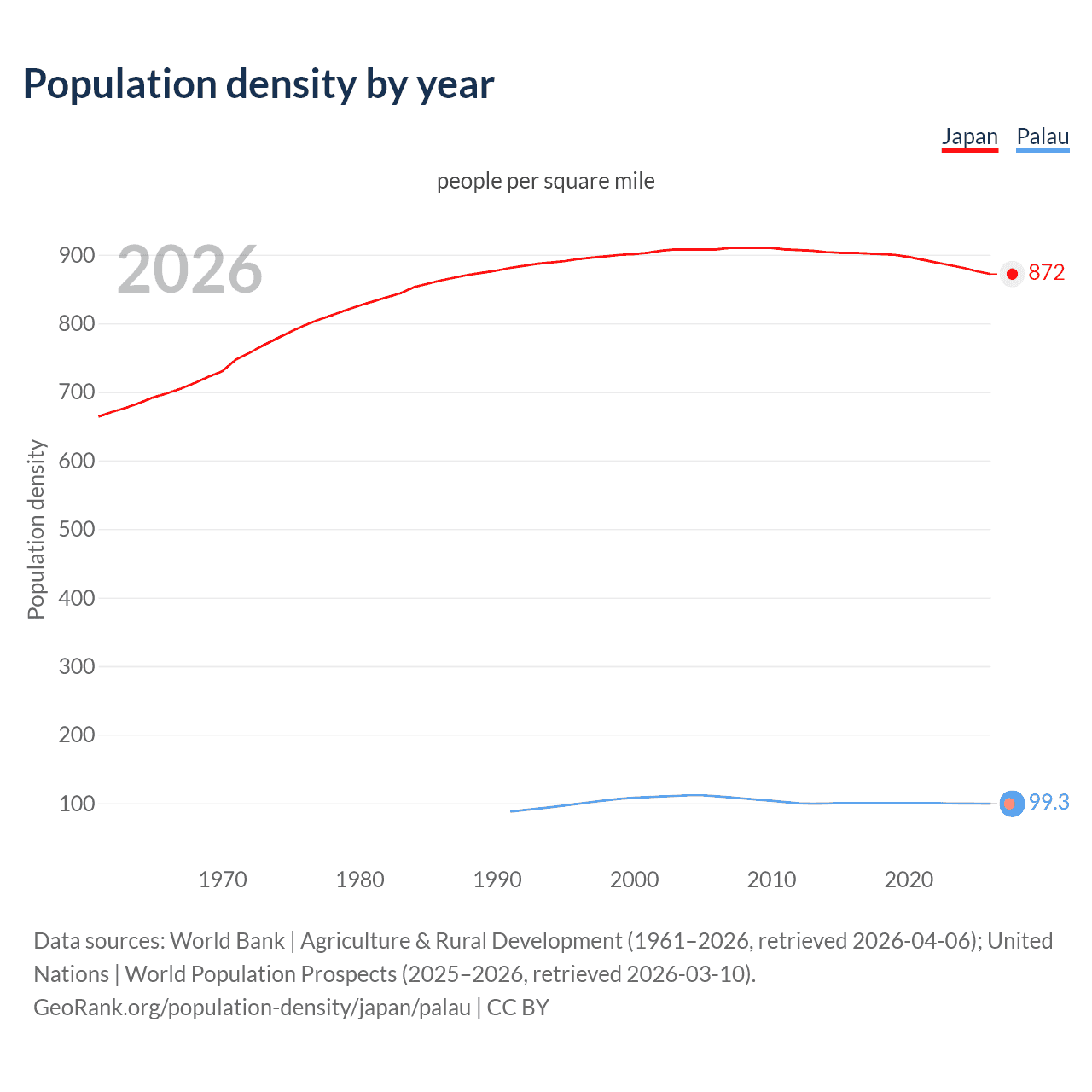 From 2006 to 2026, population density in Japan decreased by 4.07%, compared to a 10% decline in Palau.