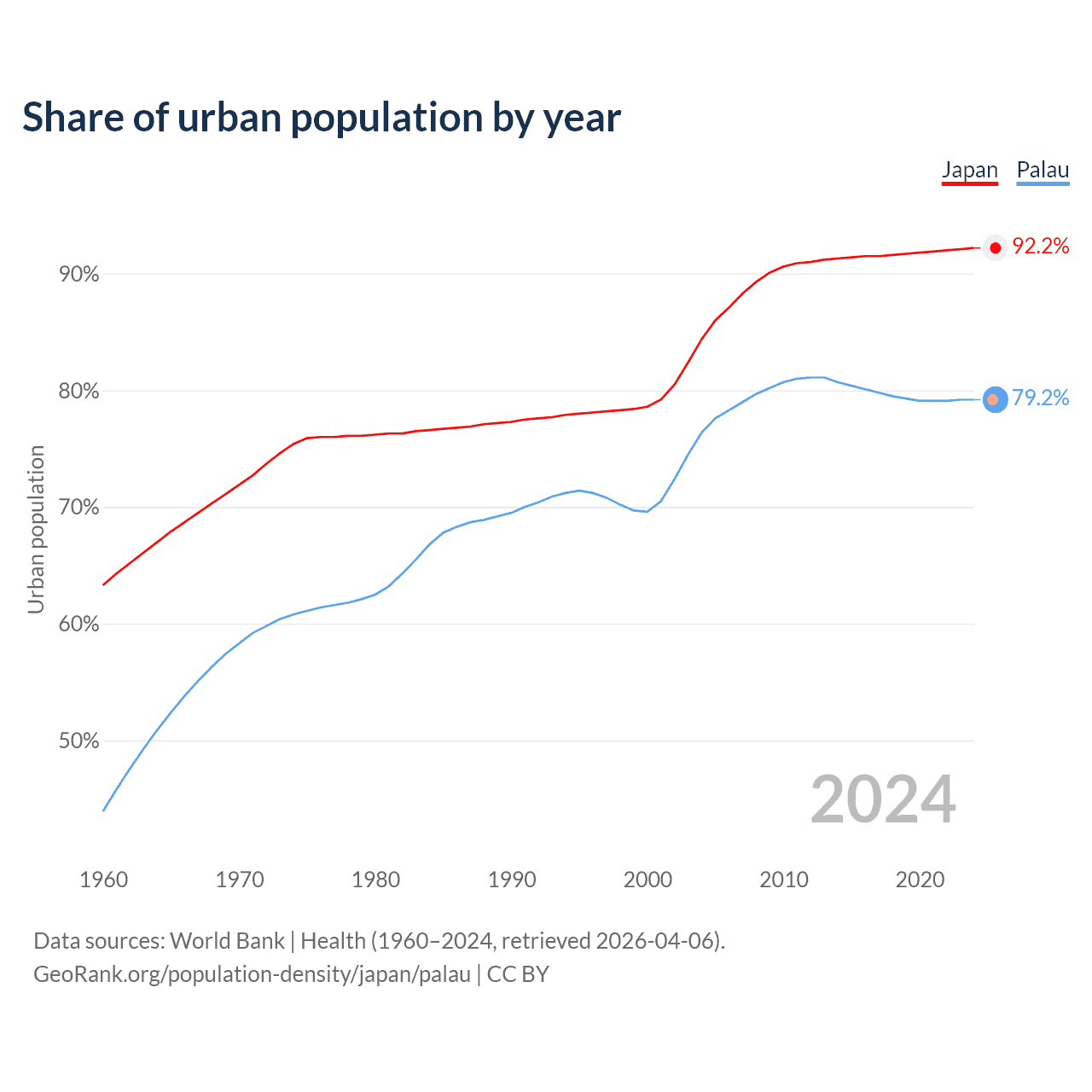 From 2004 to 2024, the share of urban population changed from 84.4% to 92.2% in Japan and from 76.4% to 79.2% in Palau.