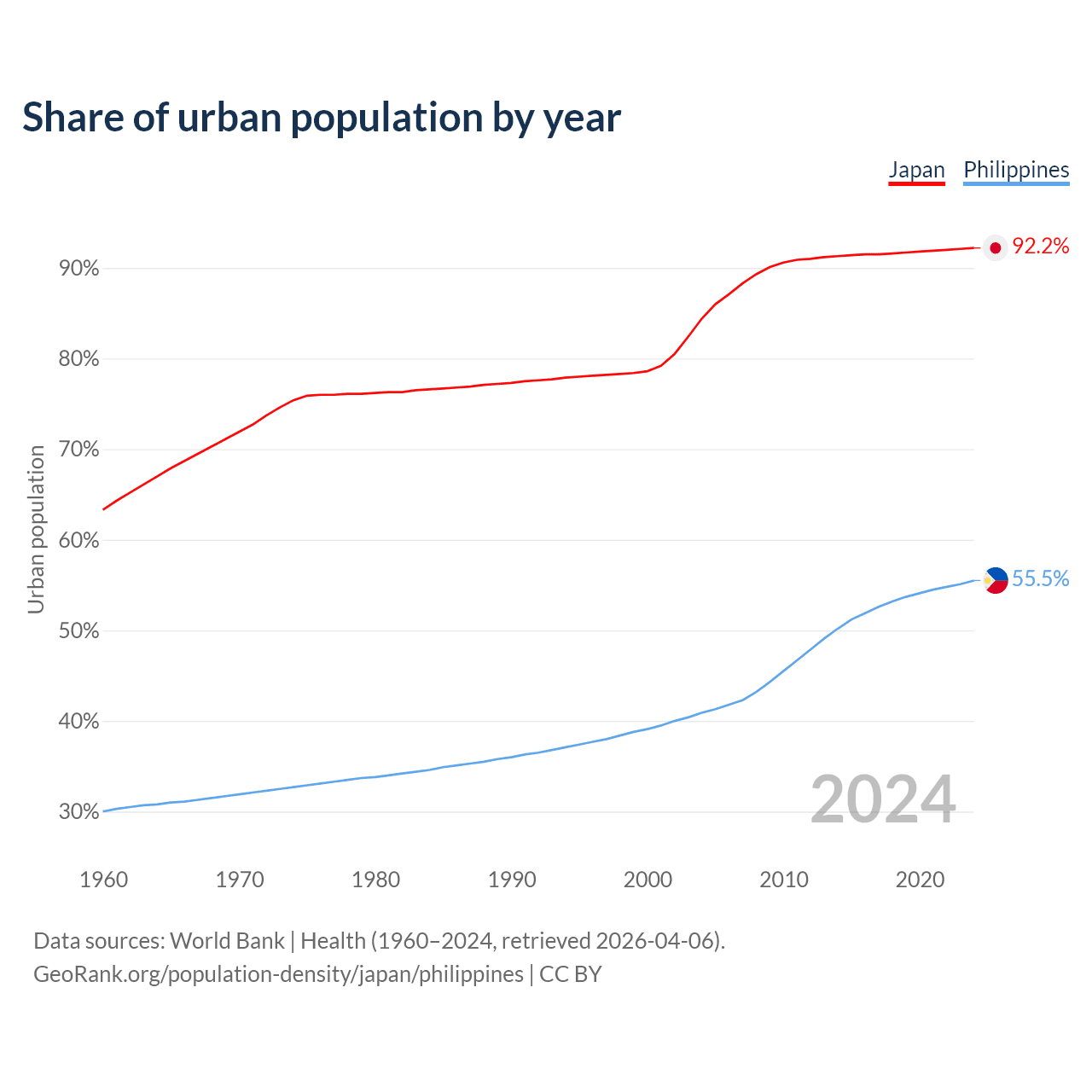 From 2004 to 2024, the share of urban population changed from 84.4% to 92.2% in Japan and from 40.9% to 55.5% in the Philippines.