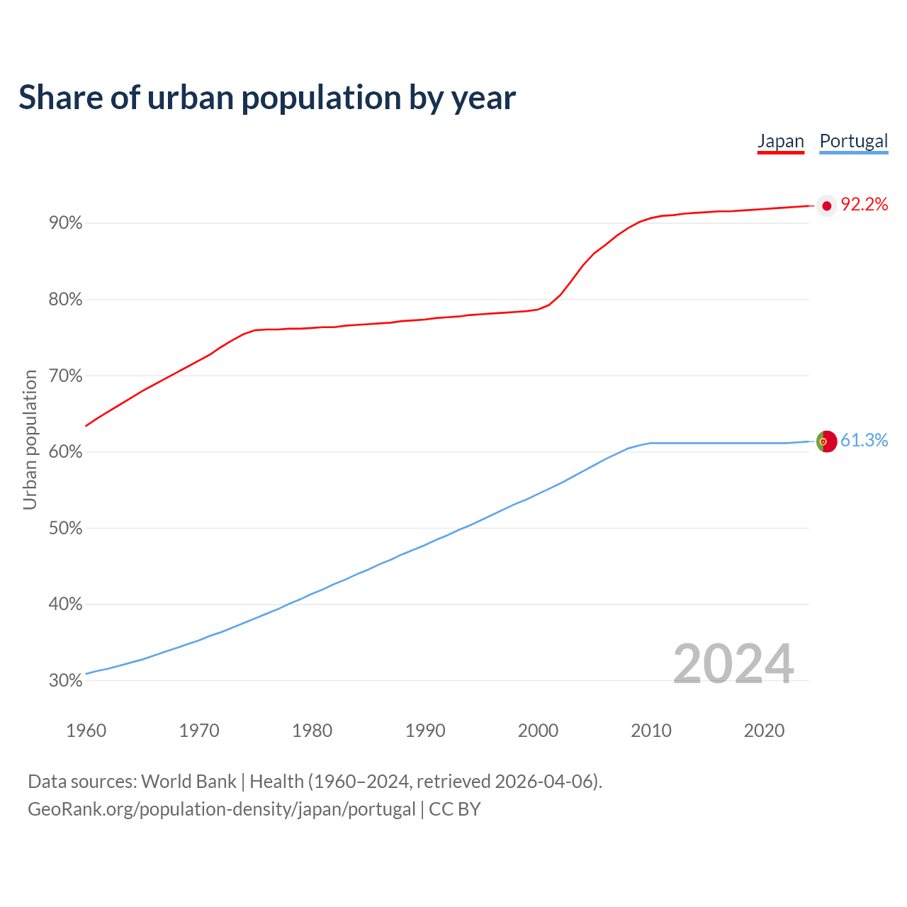 From 2004 to 2024, the share of urban population changed from 84.4% to 92.2% in Japan and from 57.4% to 61.3% in Portugal.