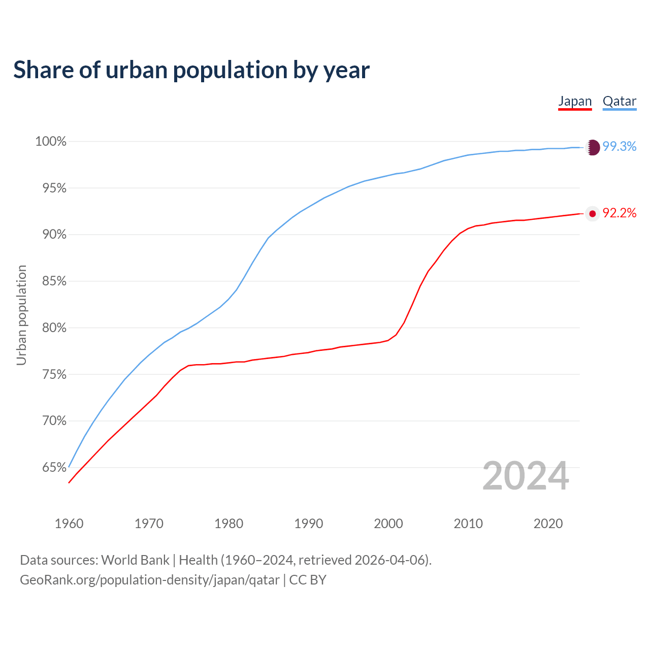 From 2004 to 2024, the share of urban population changed from 84.4% to 92.2% in Japan and from 97% to 99.3% in Qatar.