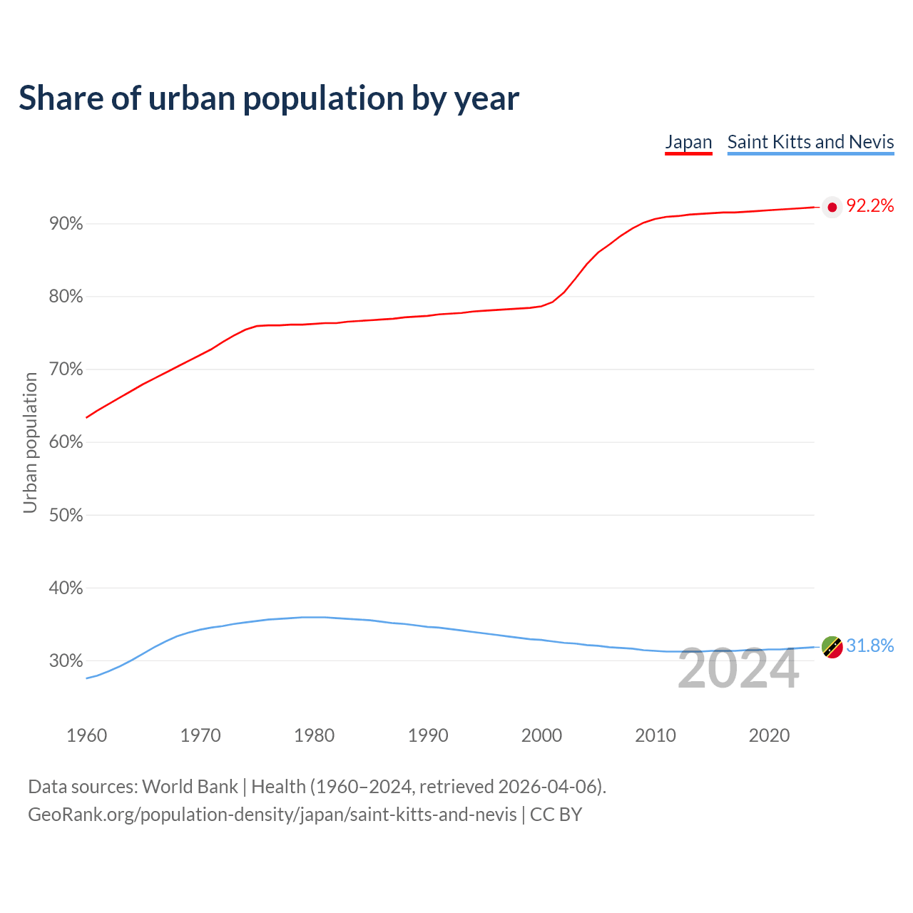 From 2004 to 2024, the share of urban population changed from 84.4% to 92.2% in Japan and from 32.1% to 31.8% in Saint Kitts and Nevis.
