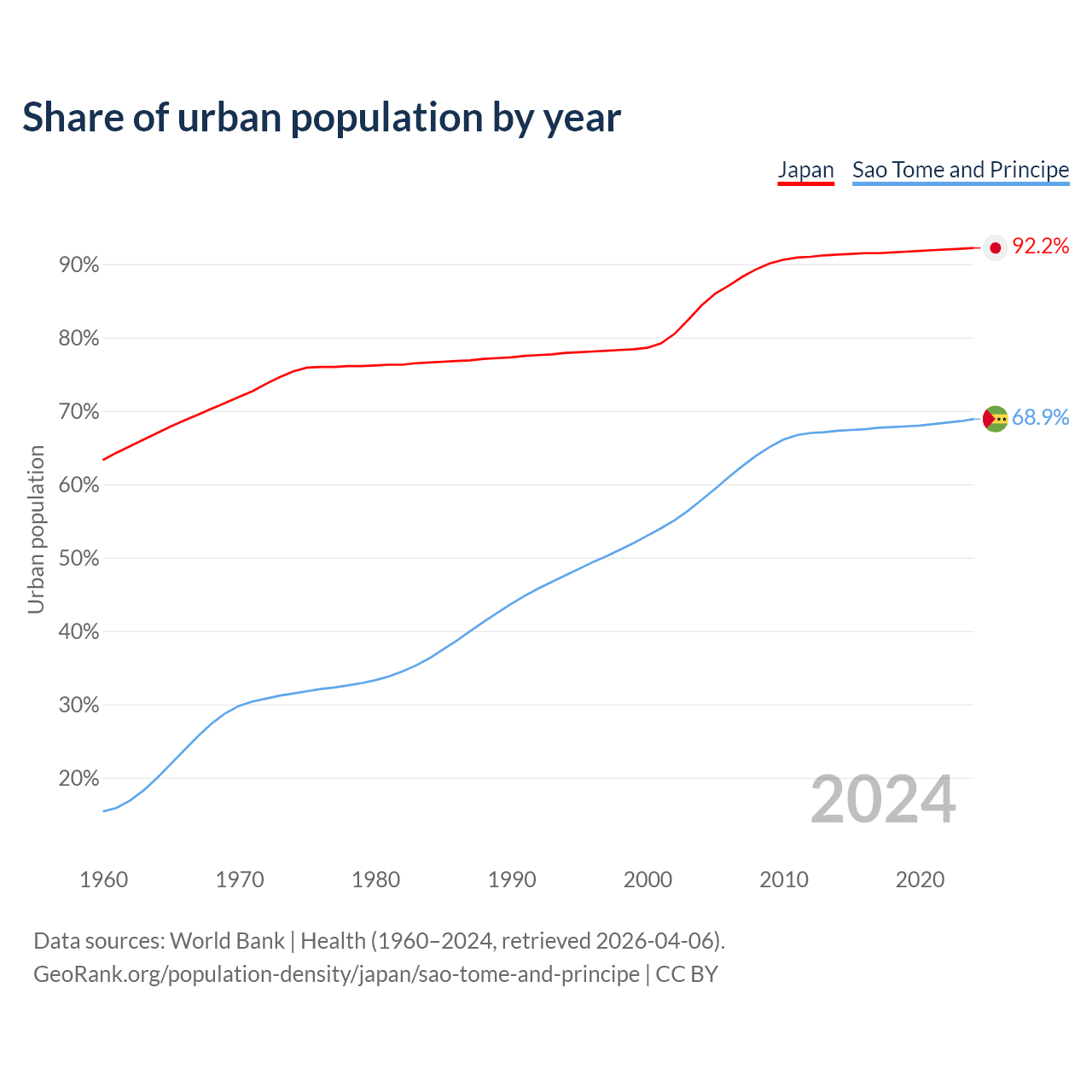 From 2004 to 2024, the share of urban population changed from 84.4% to 92.2% in Japan and from 57.9% to 68.9% in Sao Tome and Principe.
