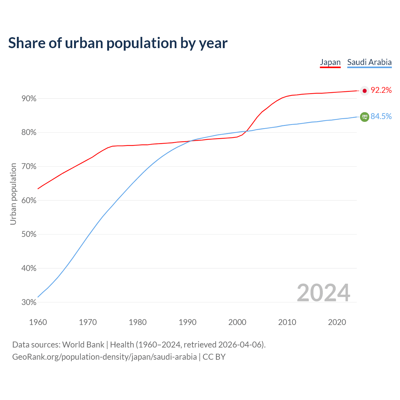 From 2004 to 2024, the share of urban population changed from 84.4% to 92.2% in Japan and from 80.8% to 84.5% in Saudi Arabia.