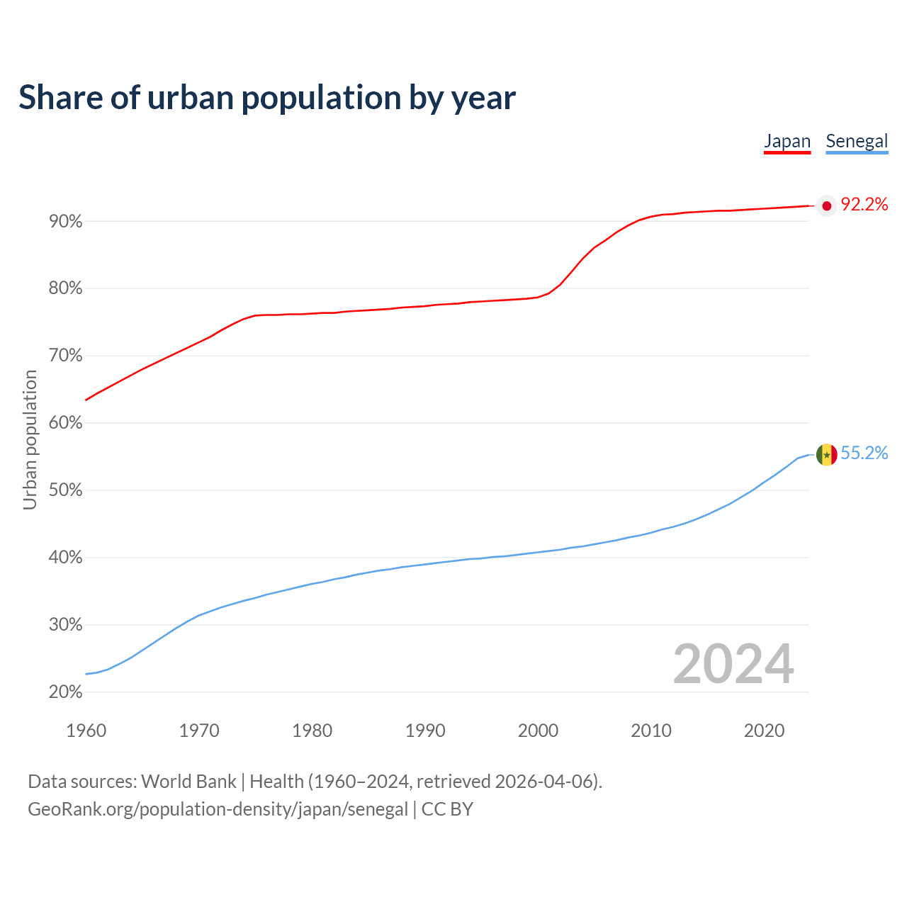 From 2004 to 2024, the share of urban population changed from 84.4% to 92.2% in Japan and from 41.6% to 55.2% in Senegal.