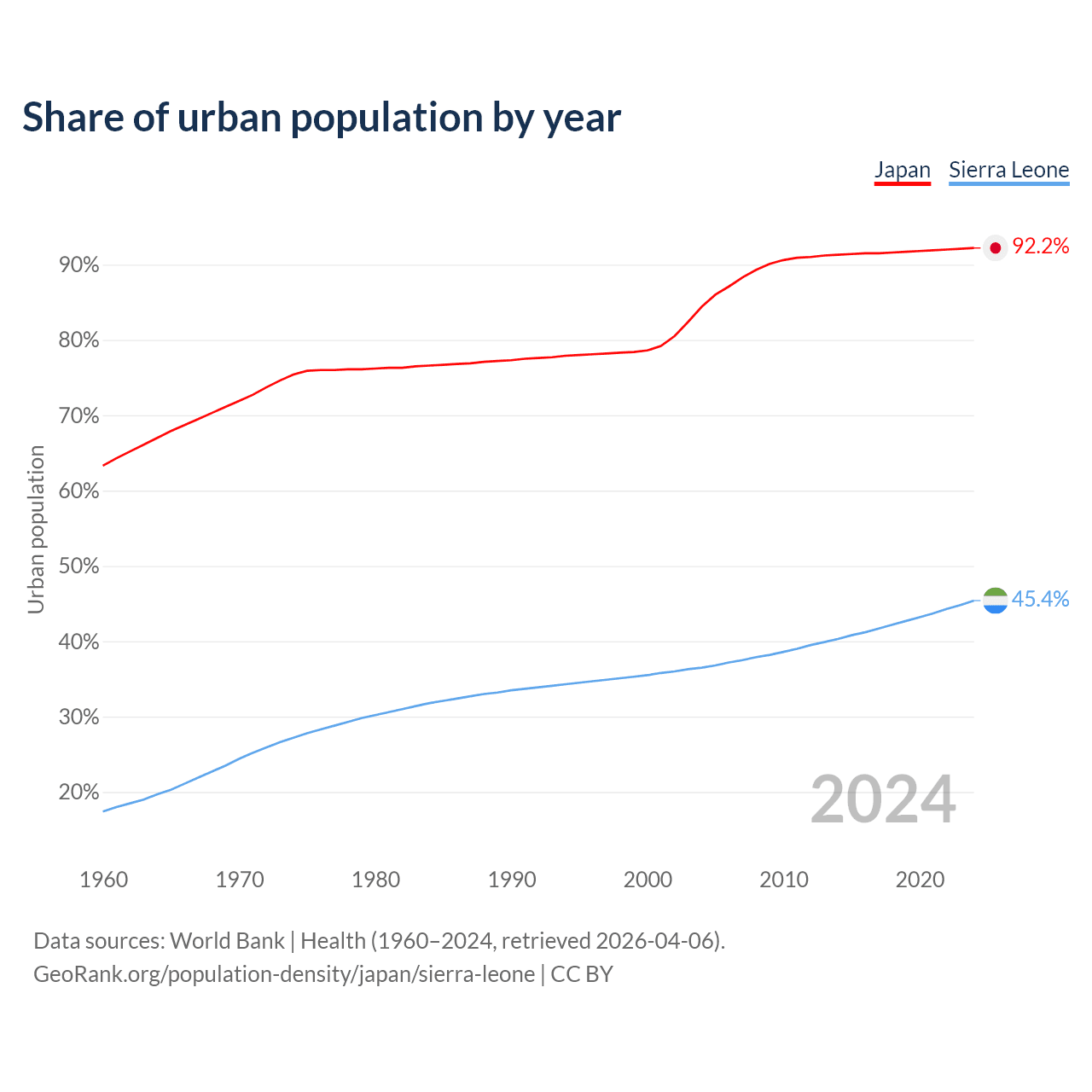From 2004 to 2024, the share of urban population changed from 84.4% to 92.2% in Japan and from 36.5% to 45.4% in Sierra Leone.