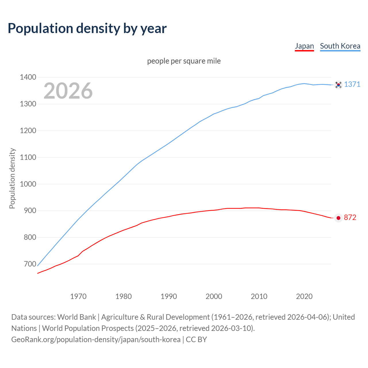 From 2006 to 2026, population density in Japan decreased by 4.07%, compared to a 5.84% growth in South Korea.