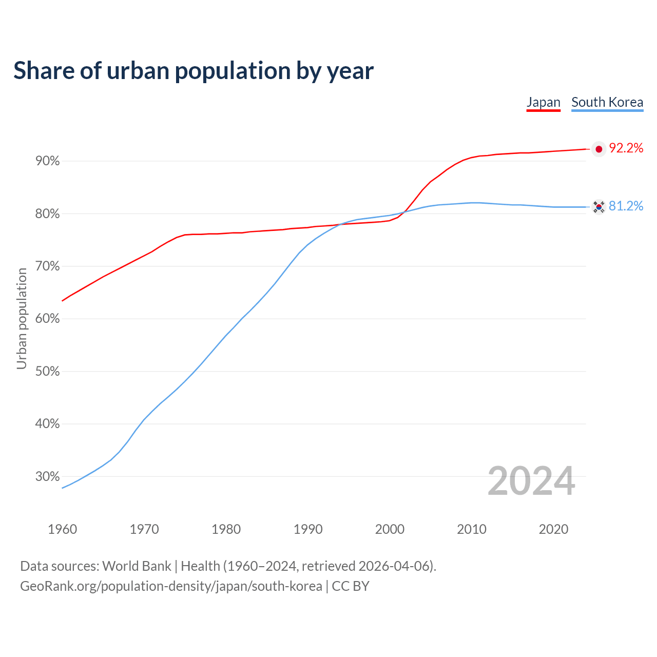 From 2004 to 2024, the share of urban population changed from 84.4% to 92.2% in Japan and from 81.1% to 81.2% in South Korea.
