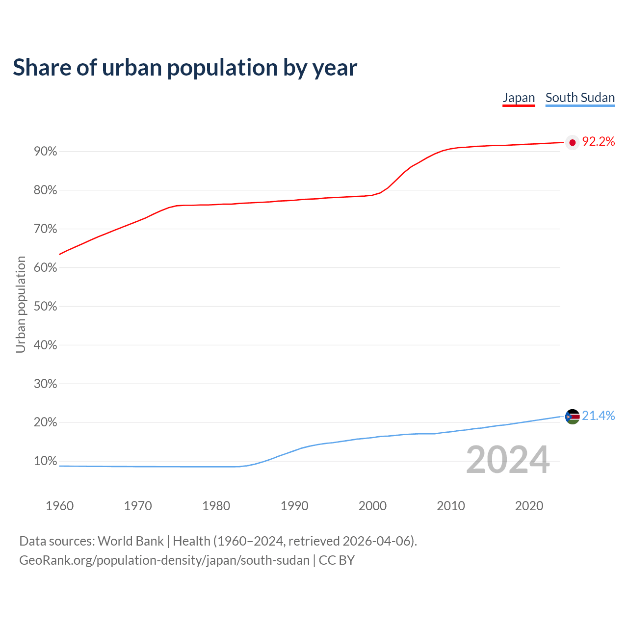From 2004 to 2024, the share of urban population changed from 84.4% to 92.2% in Japan and from 16.8% to 21.4% in South Sudan.