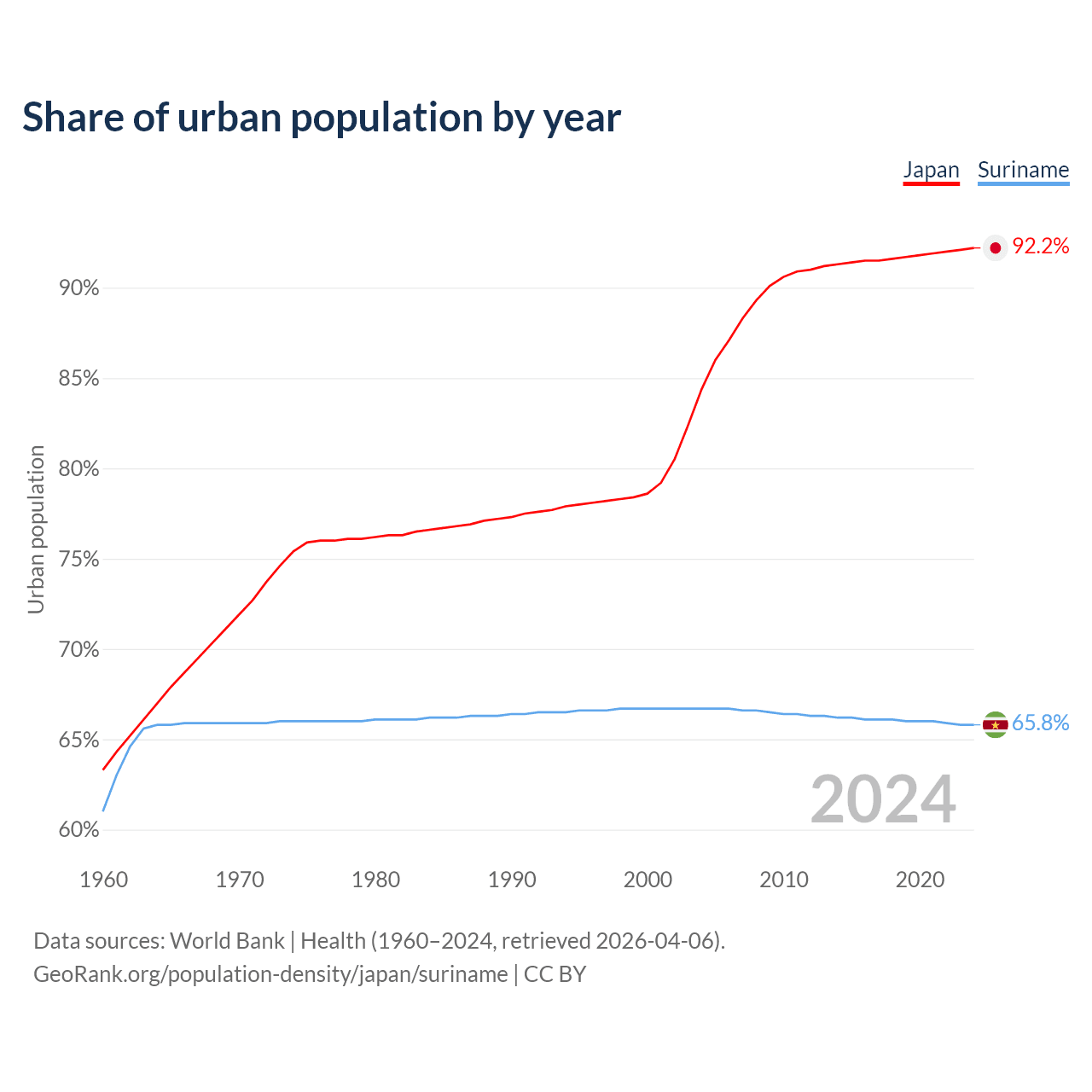 From 2004 to 2024, the share of urban population changed from 84.4% to 92.2% in Japan and from 66.7% to 65.8% in Suriname.