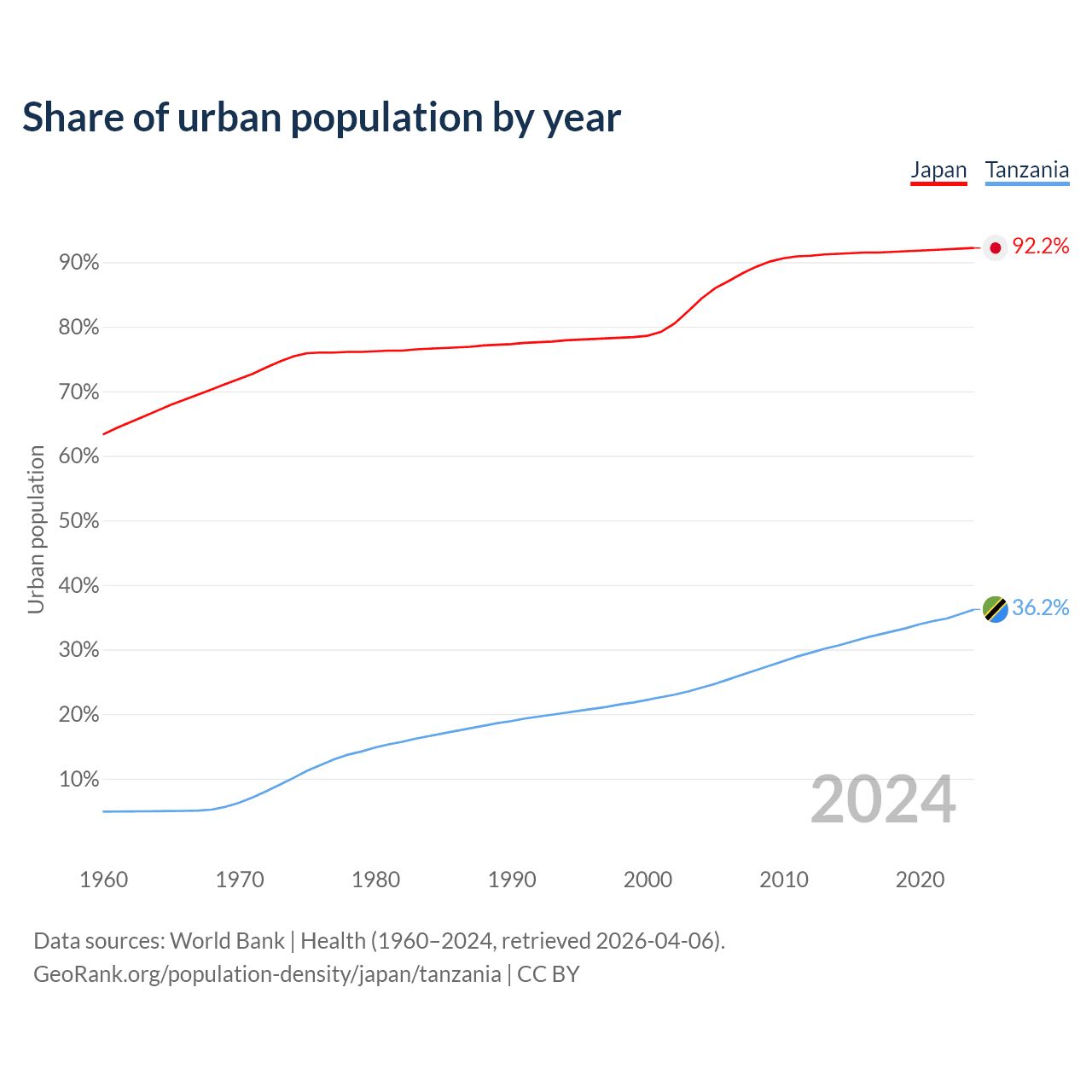From 2004 to 2024, the share of urban population changed from 84.4% to 92.2% in Japan and from 24.1% to 36.2% in Tanzania.