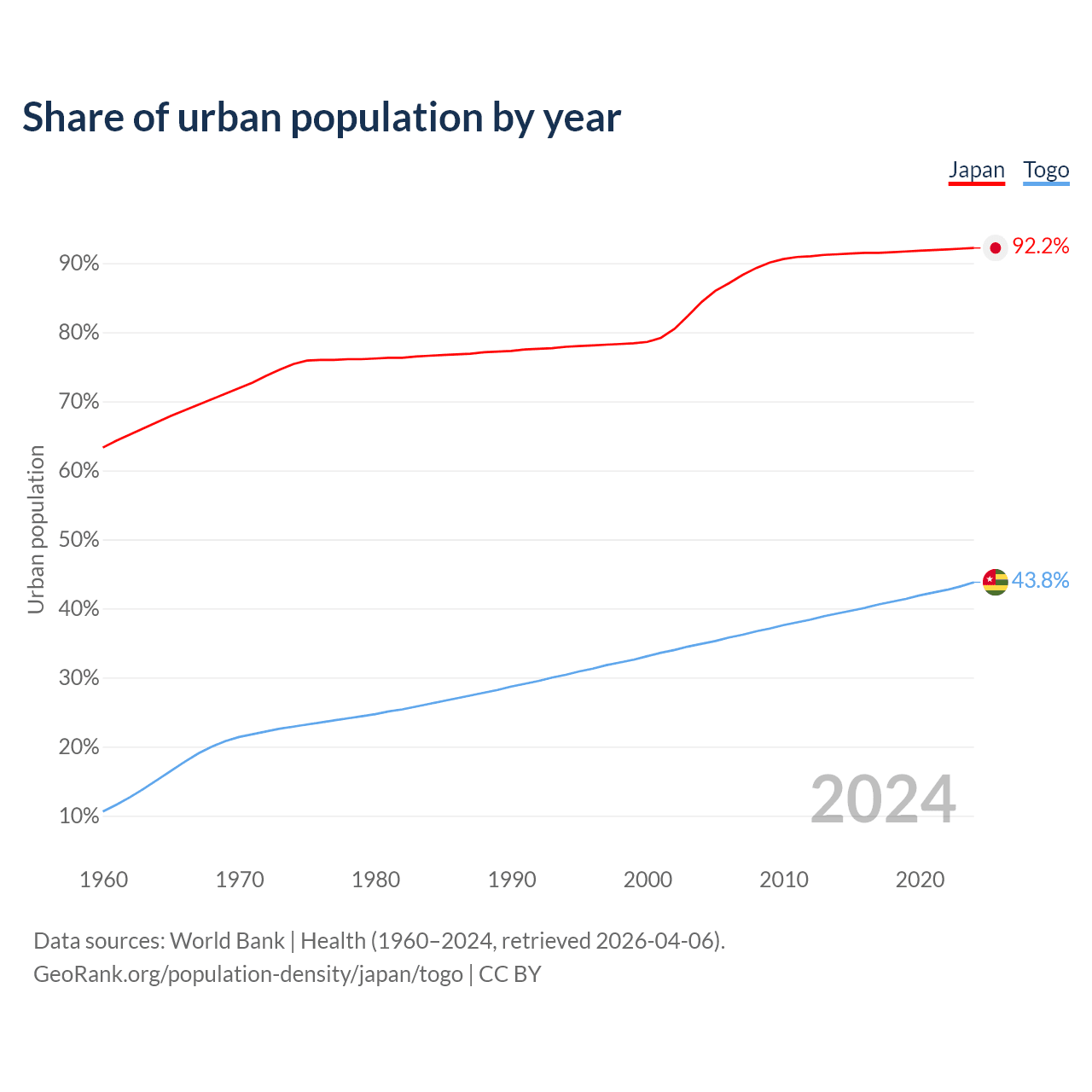 From 2004 to 2024, the share of urban population changed from 84.4% to 92.2% in Japan and from 34.9% to 43.8% in Togo.