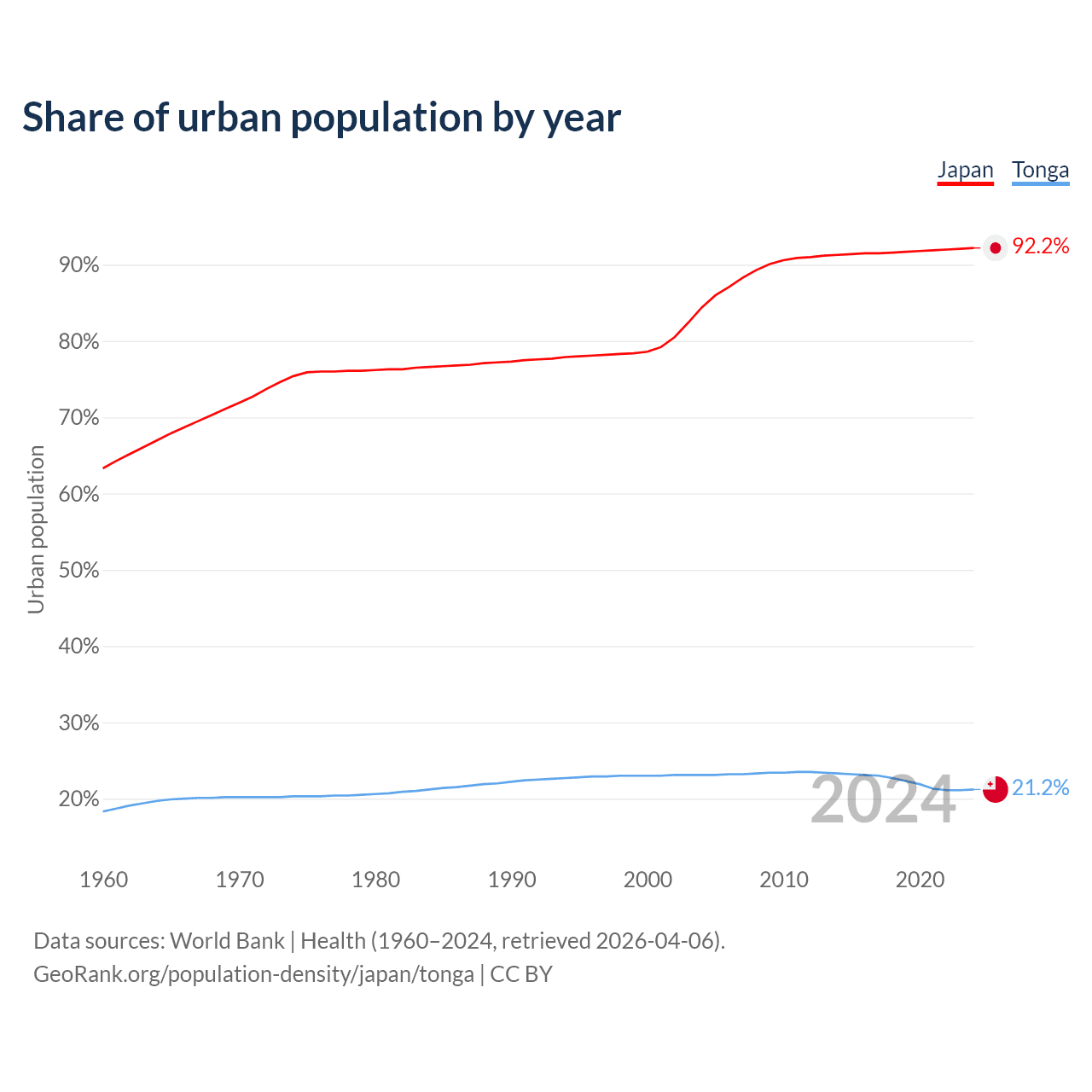 From 2004 to 2024, the share of urban population changed from 84.4% to 92.2% in Japan and from 23.1% to 21.2% in Tonga.