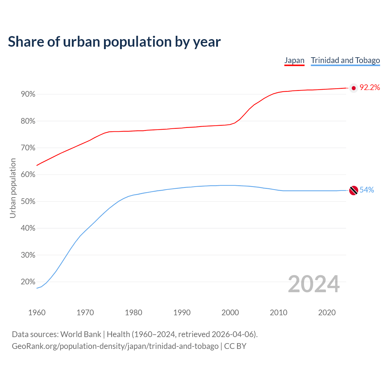 From 2004 to 2024, the share of urban population changed from 84.4% to 92.2% in Japan and from 55.6% to 54% in Trinidad and Tobago.