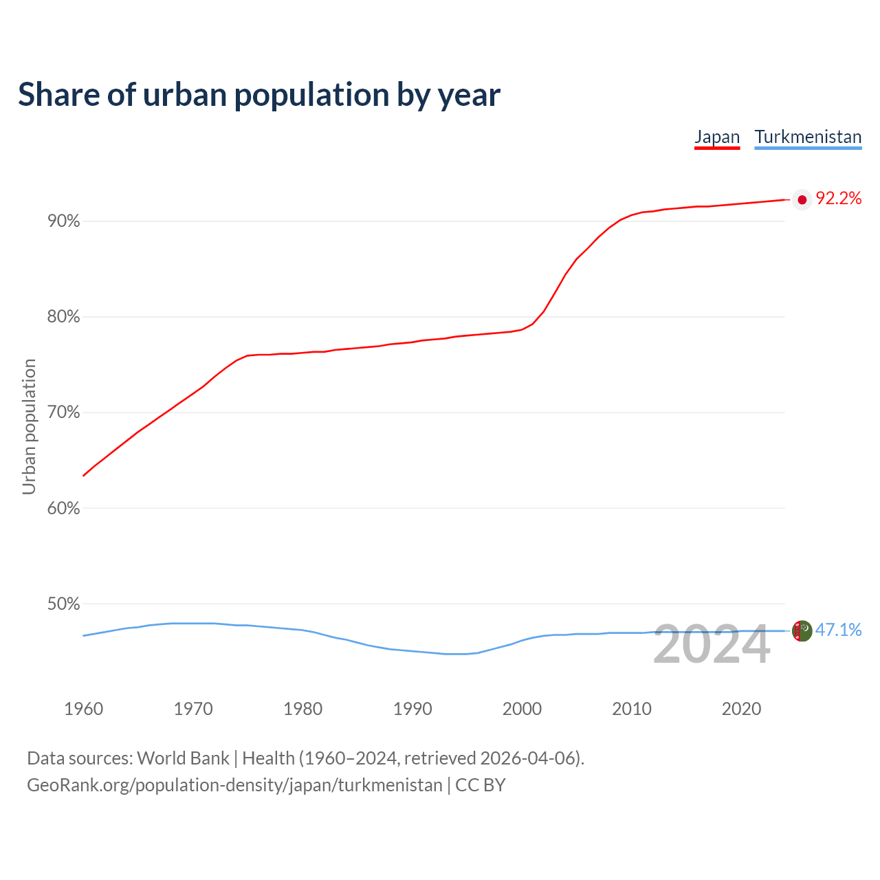 From 2004 to 2024, the share of urban population changed from 84.4% to 92.2% in Japan and from 46.7% to 47.1% in Turkmenistan.