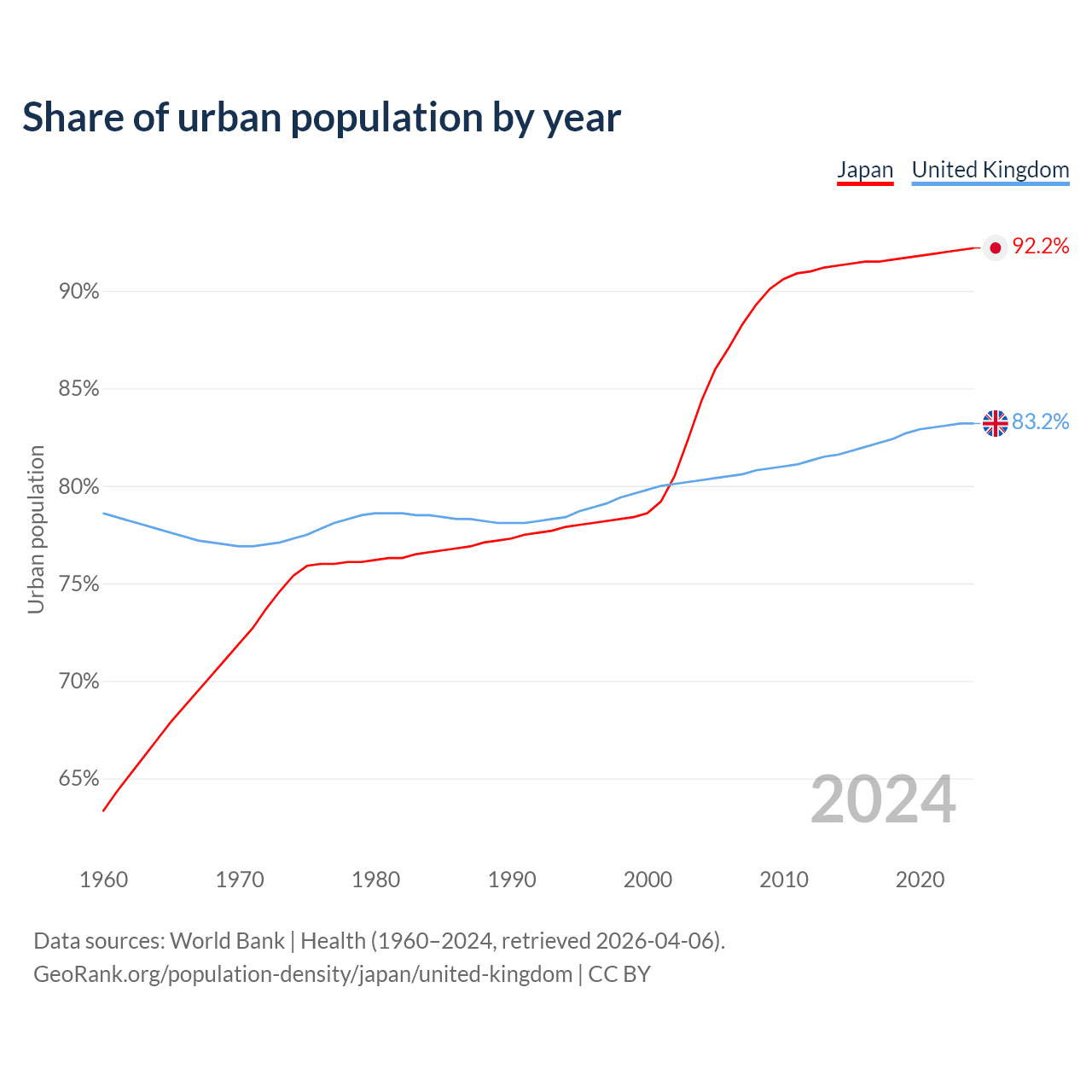 From 2004 to 2024, the share of urban population changed from 84.4% to 92.2% in Japan and from 80.3% to 83.2% in the United Kingdom.