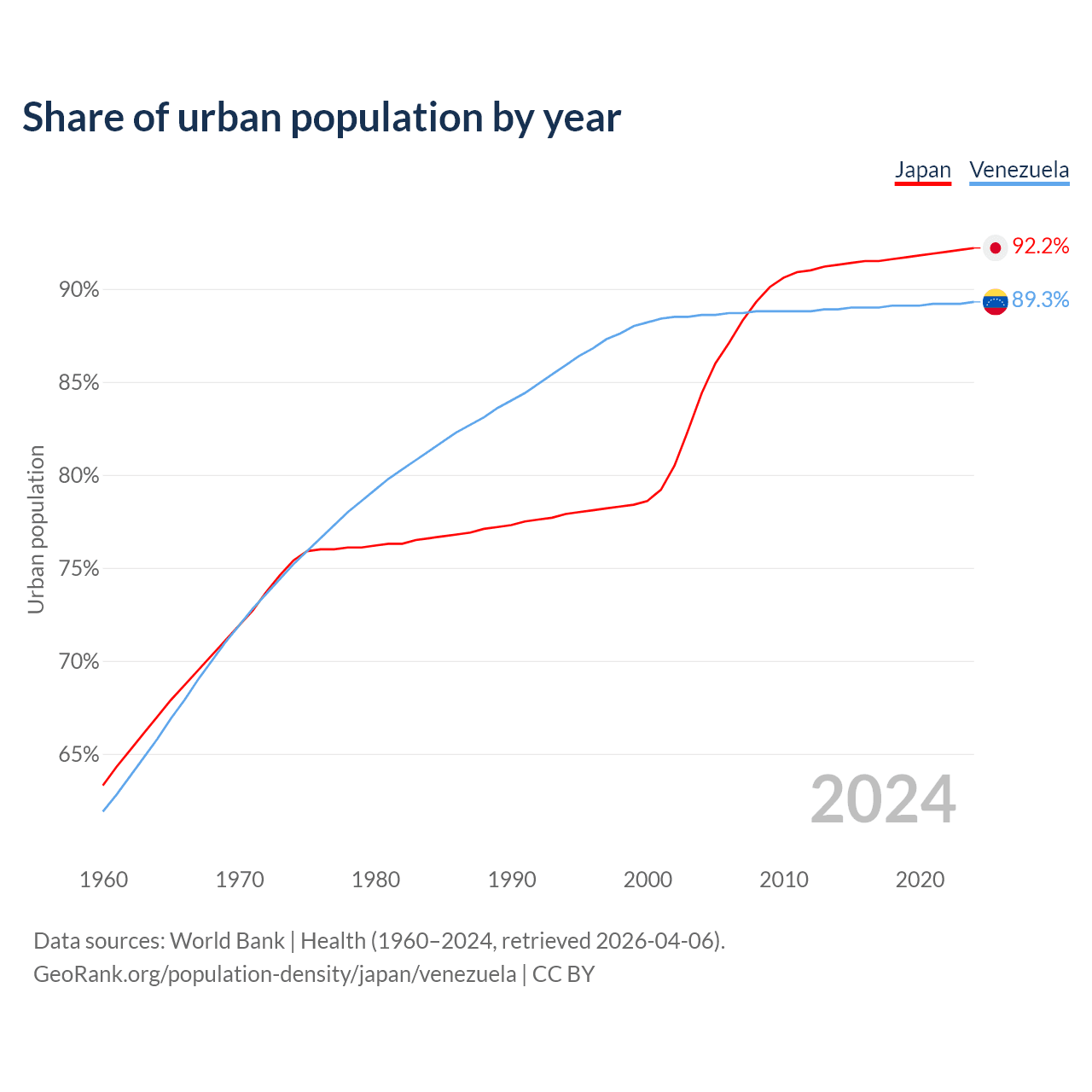 From 2004 to 2024, the share of urban population changed from 84.4% to 92.2% in Japan and from 88.6% to 89.3% in Venezuela.