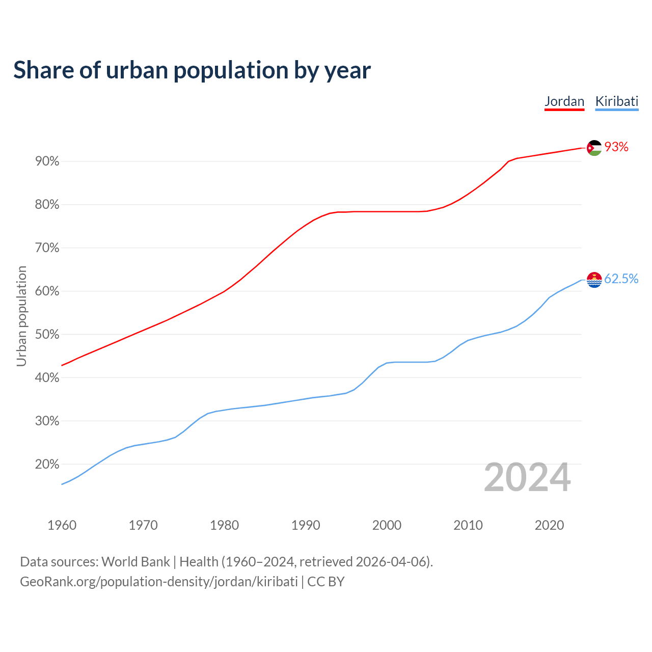 From 2004 to 2024, the share of urban population changed from 78.3% to 93% in Jordan and from 43.5% to 62.5% in Kiribati.