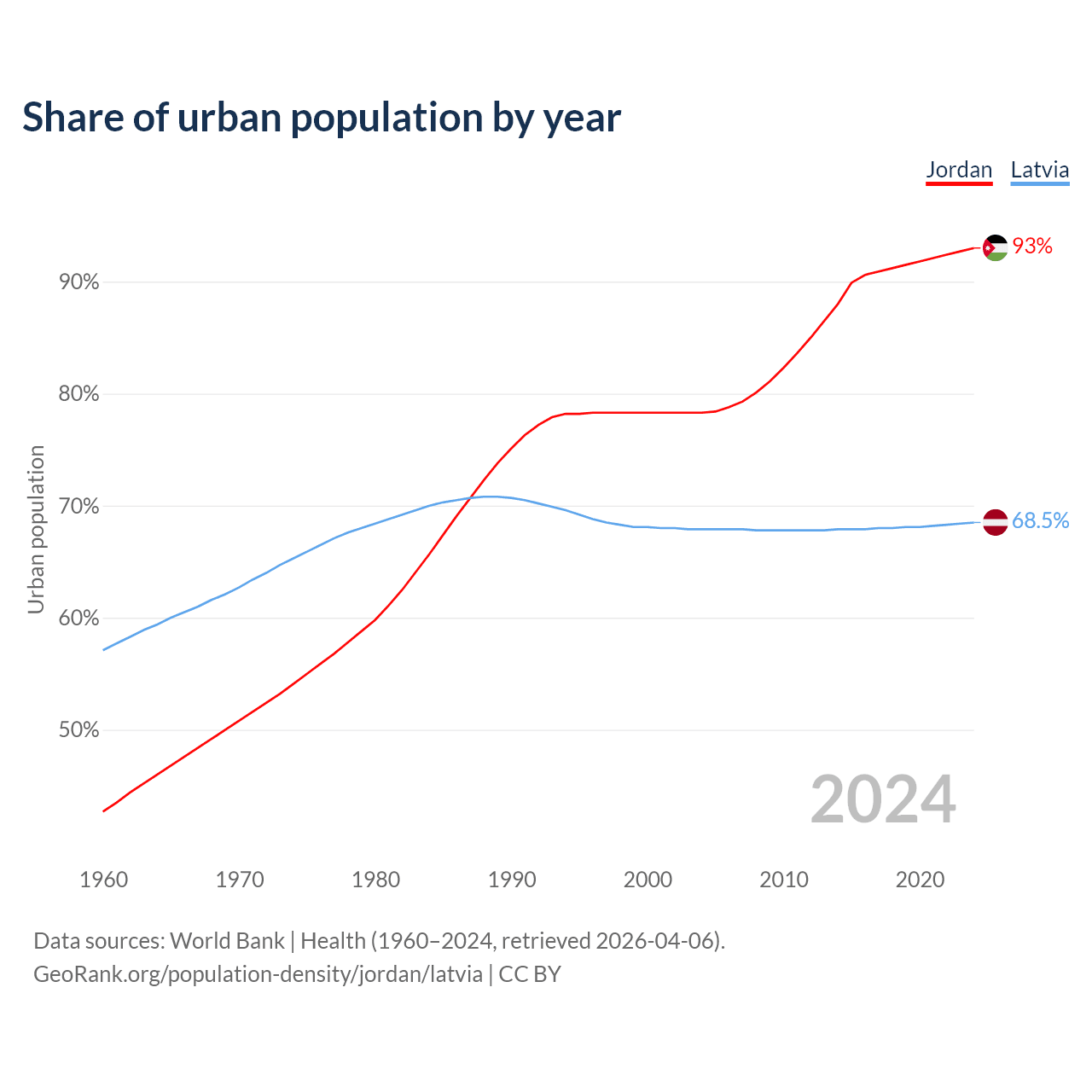 From 2004 to 2024, the share of urban population changed from 78.3% to 93% in Jordan and from 67.9% to 68.5% in Latvia.
