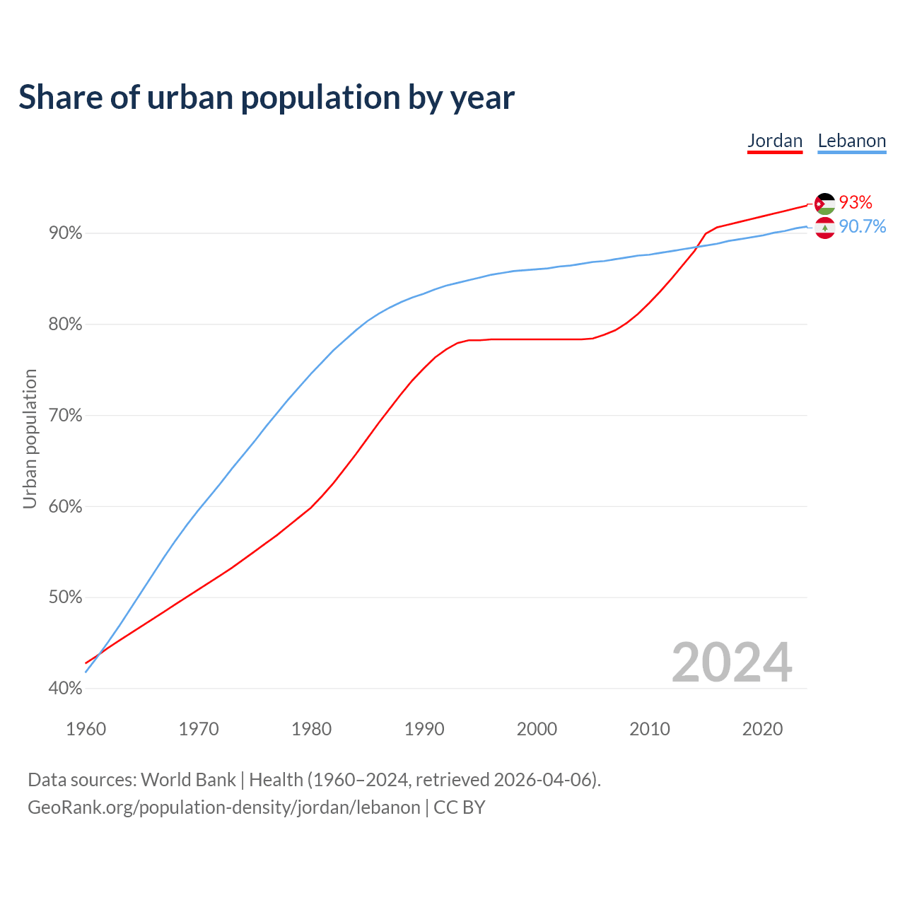 From 2004 to 2024, the share of urban population changed from 78.3% to 93% in Jordan and from 86.6% to 90.7% in Lebanon.