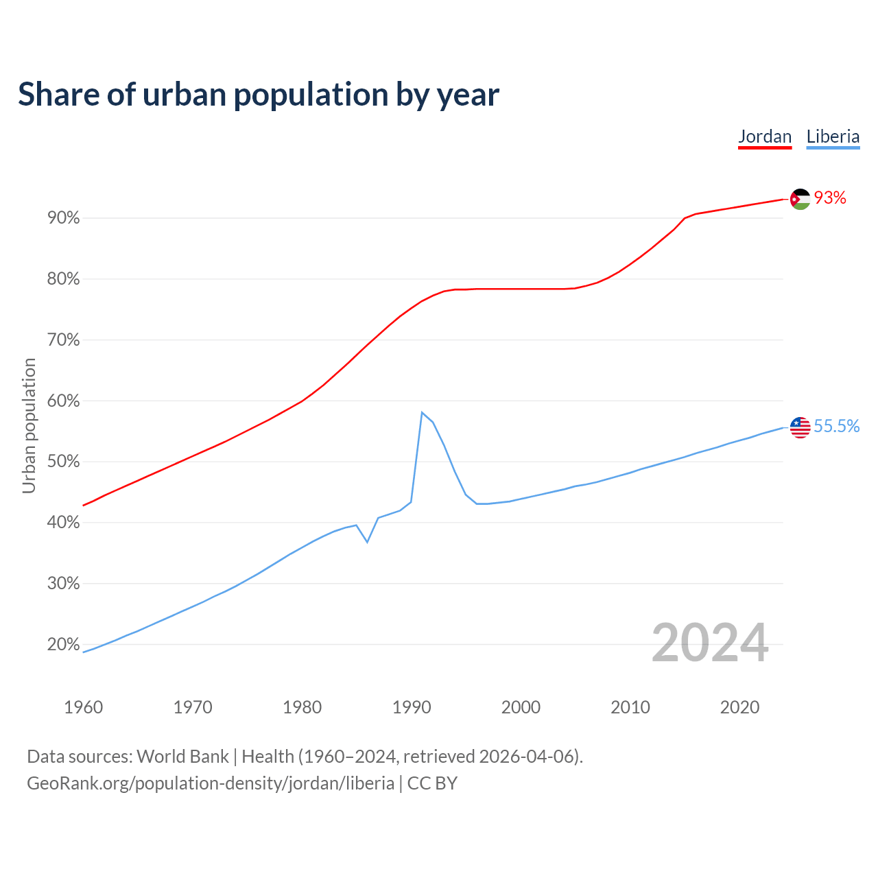 From 2004 to 2024, the share of urban population changed from 78.3% to 93% in Jordan and from 45.4% to 55.5% in Liberia.