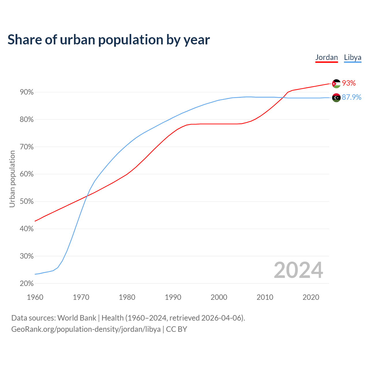 From 2004 to 2024, the share of urban population changed from 78.3% to 93% in Jordan and from 88% to 87.9% in Libya.