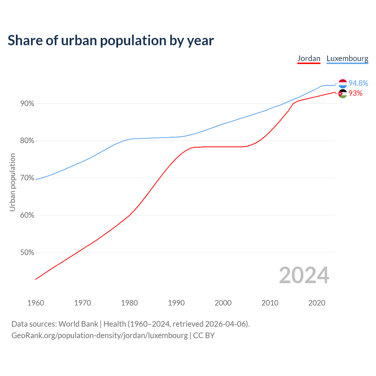 From 2004 to 2024, the share of urban population changed from 78.3% to 93% in Jordan and from 86% to 94.8% in Luxembourg.