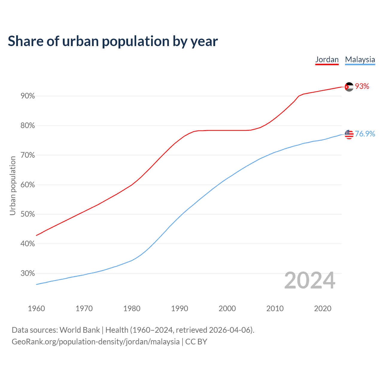 From 2004 to 2024, the share of urban population changed from 78.3% to 93% in Jordan and from 66.1% to 76.9% in Malaysia.