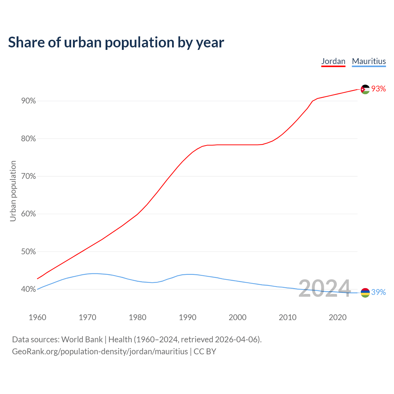 From 2004 to 2024, the share of urban population changed from 78.3% to 93% in Jordan and from 41.3% to 39% in Mauritius.