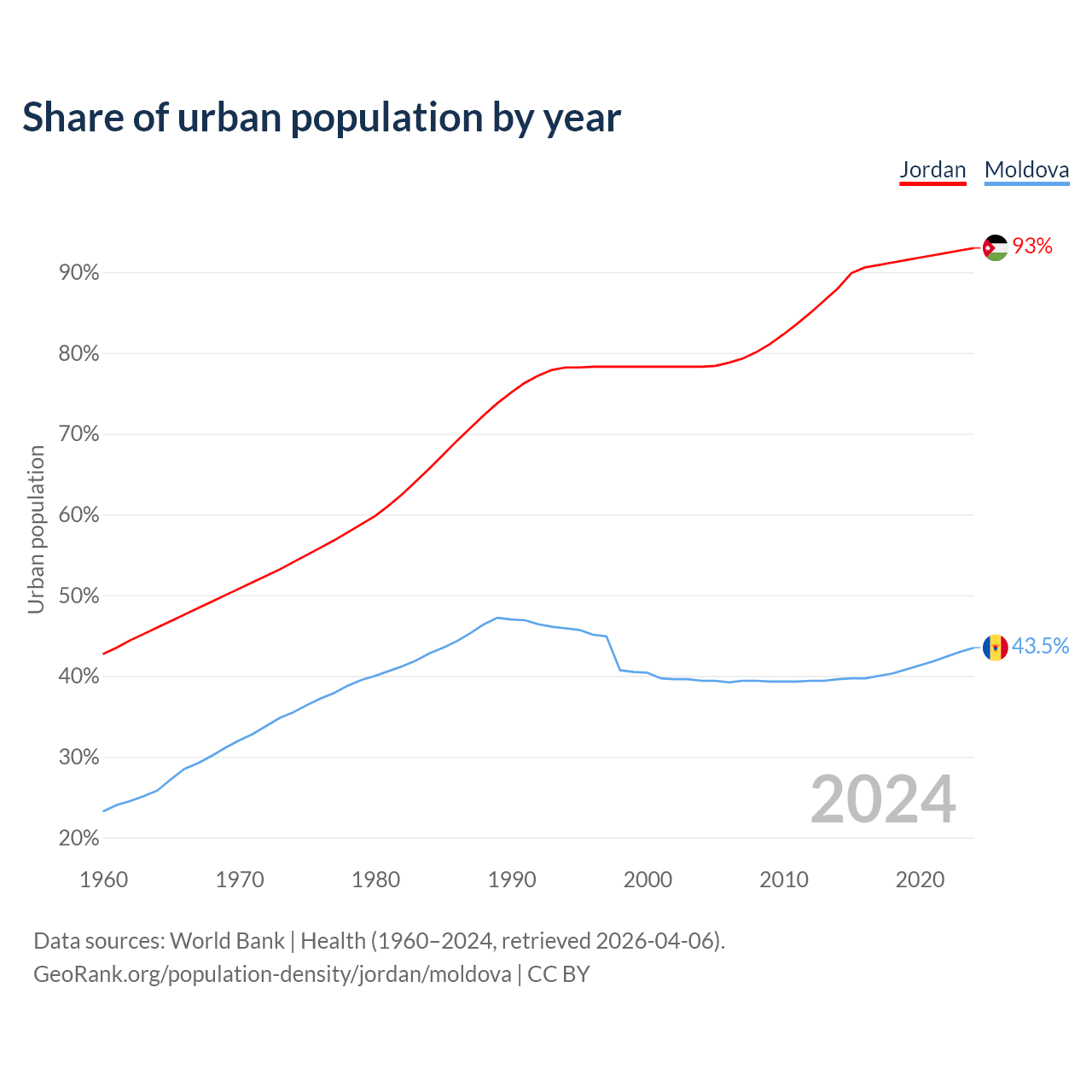 From 2004 to 2024, the share of urban population changed from 78.3% to 93% in Jordan and from 39.4% to 43.5% in Moldova.