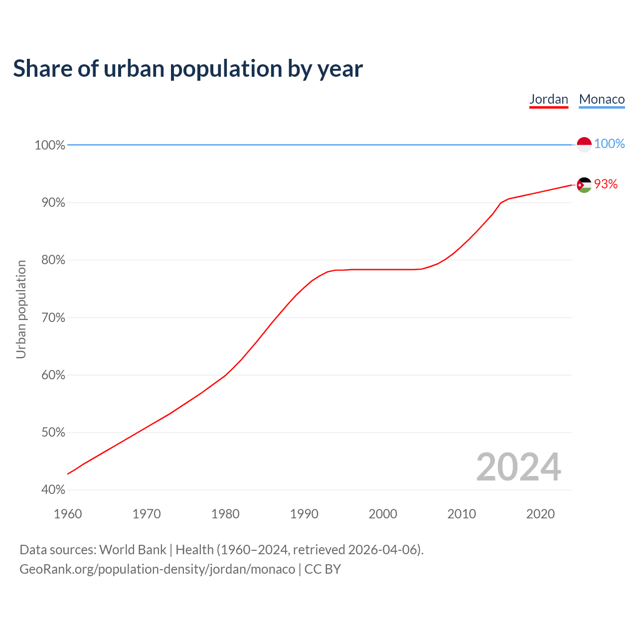 From 2004 to 2024, the share of urban population changed from 78.3% to 93% in Jordan and from 100% to 100% in Monaco.