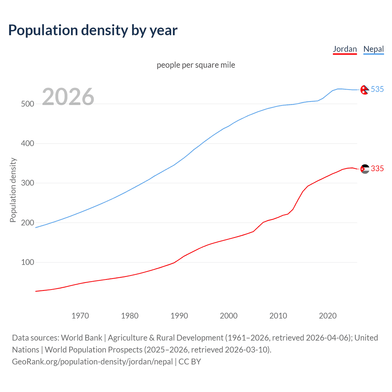 From 2006 to 2026, population density in Jordan increased by 77.6%, compared to a 11.4% growth in Nepal.