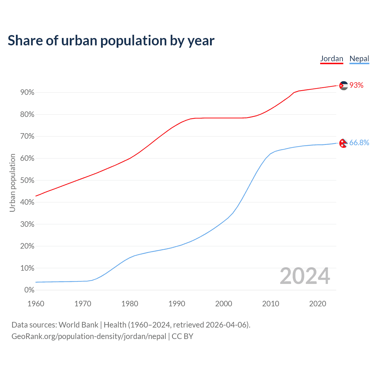From 2004 to 2024, the share of urban population changed from 78.3% to 93% in Jordan and from 41.6% to 66.8% in Nepal.