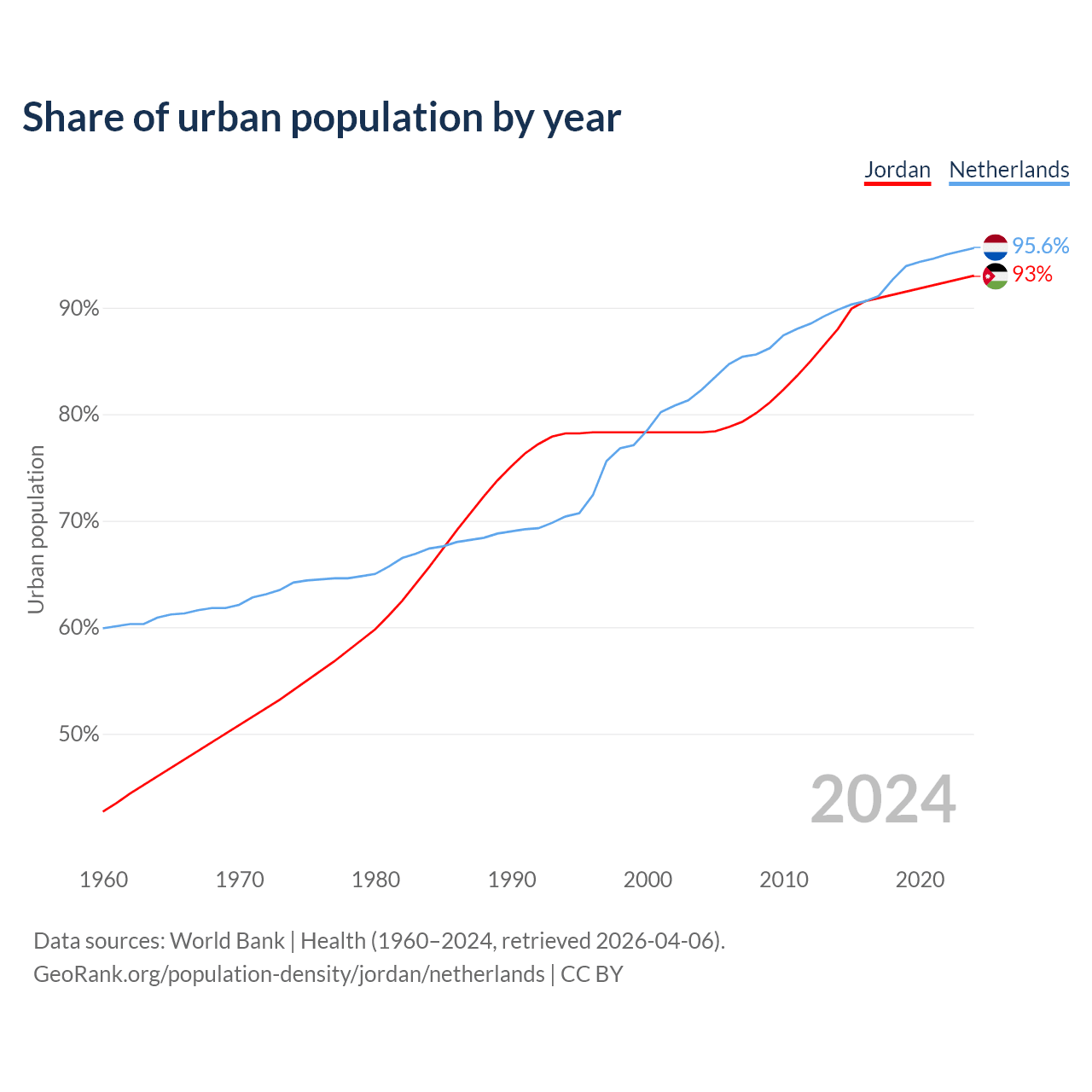 From 2004 to 2024, the share of urban population changed from 78.3% to 93% in Jordan and from 82.3% to 95.6% in the Netherlands.