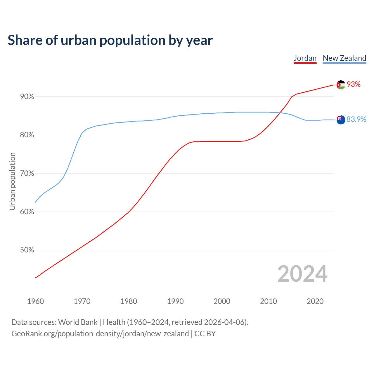 From 2004 to 2024, the share of urban population changed from 78.3% to 93% in Jordan and from 85.9% to 83.9% in New Zealand.