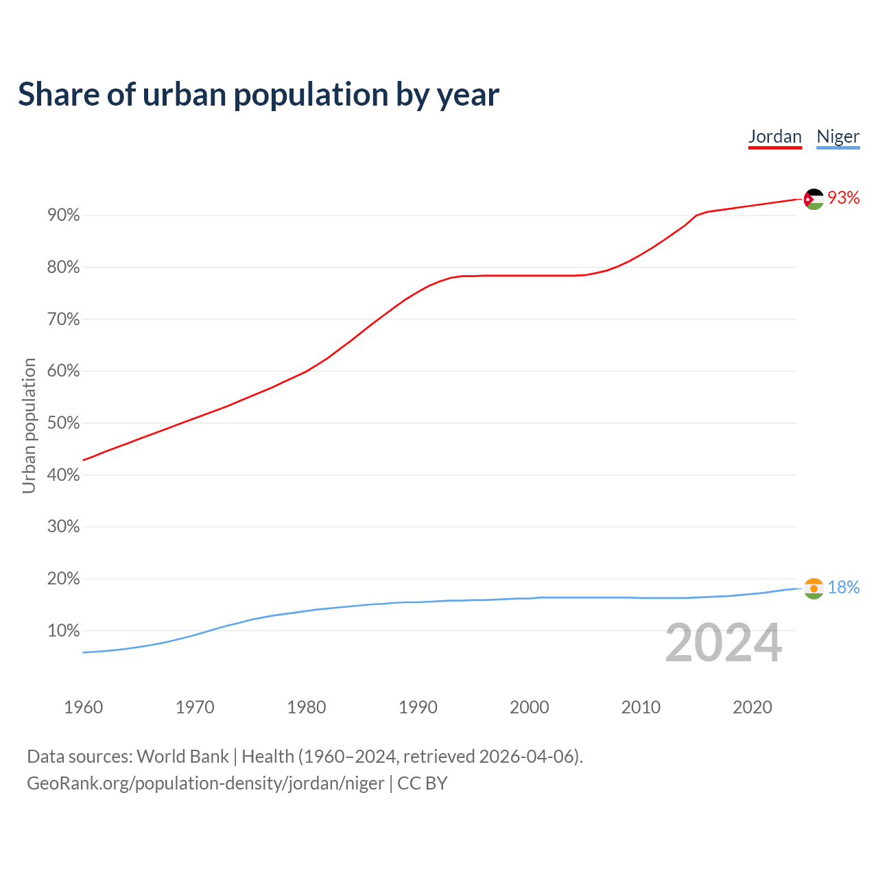 From 2004 to 2024, the share of urban population changed from 78.3% to 93% in Jordan and from 16.3% to 18% in Niger.