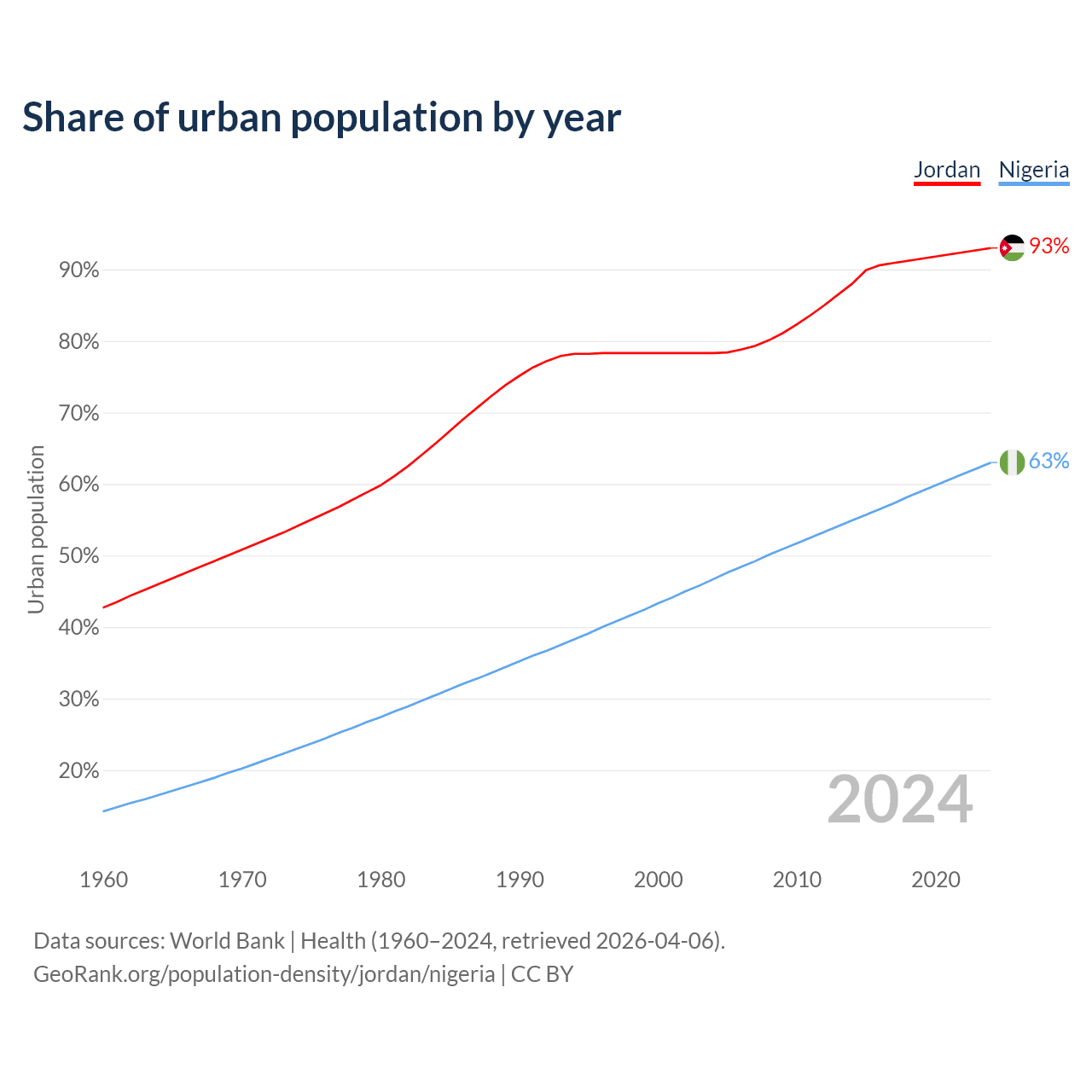 From 2004 to 2024, the share of urban population changed from 78.3% to 93% in Jordan and from 46.7% to 63% in Nigeria.