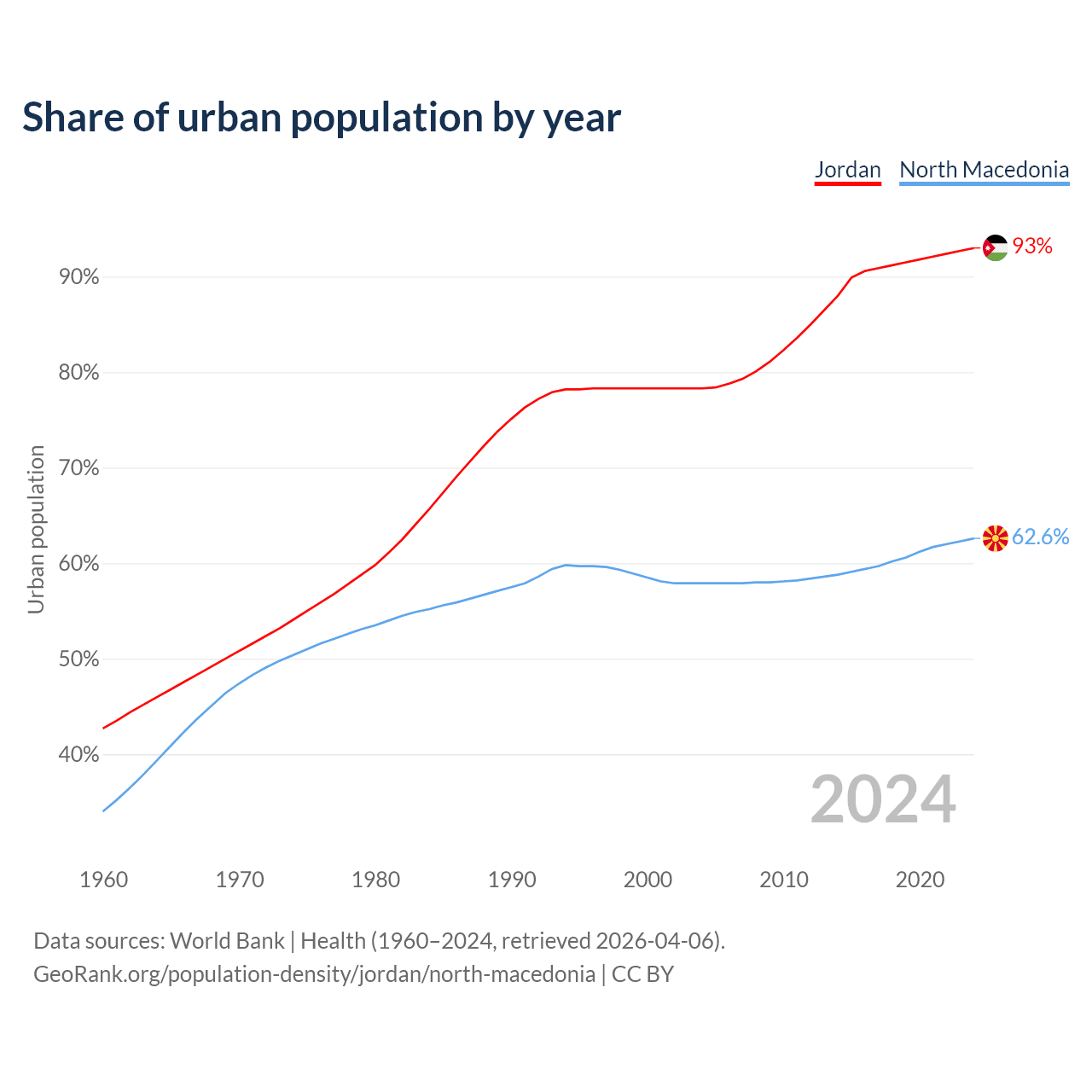 From 2004 to 2024, the share of urban population changed from 78.3% to 93% in Jordan and from 57.9% to 62.6% in North Macedonia.
