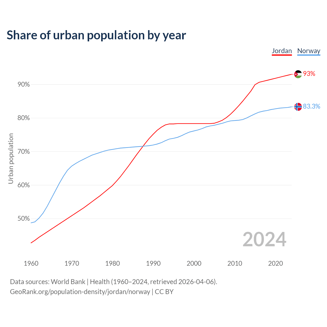 From 2004 to 2024, the share of urban population changed from 78.3% to 93% in Jordan and from 77.6% to 83.3% in Norway.