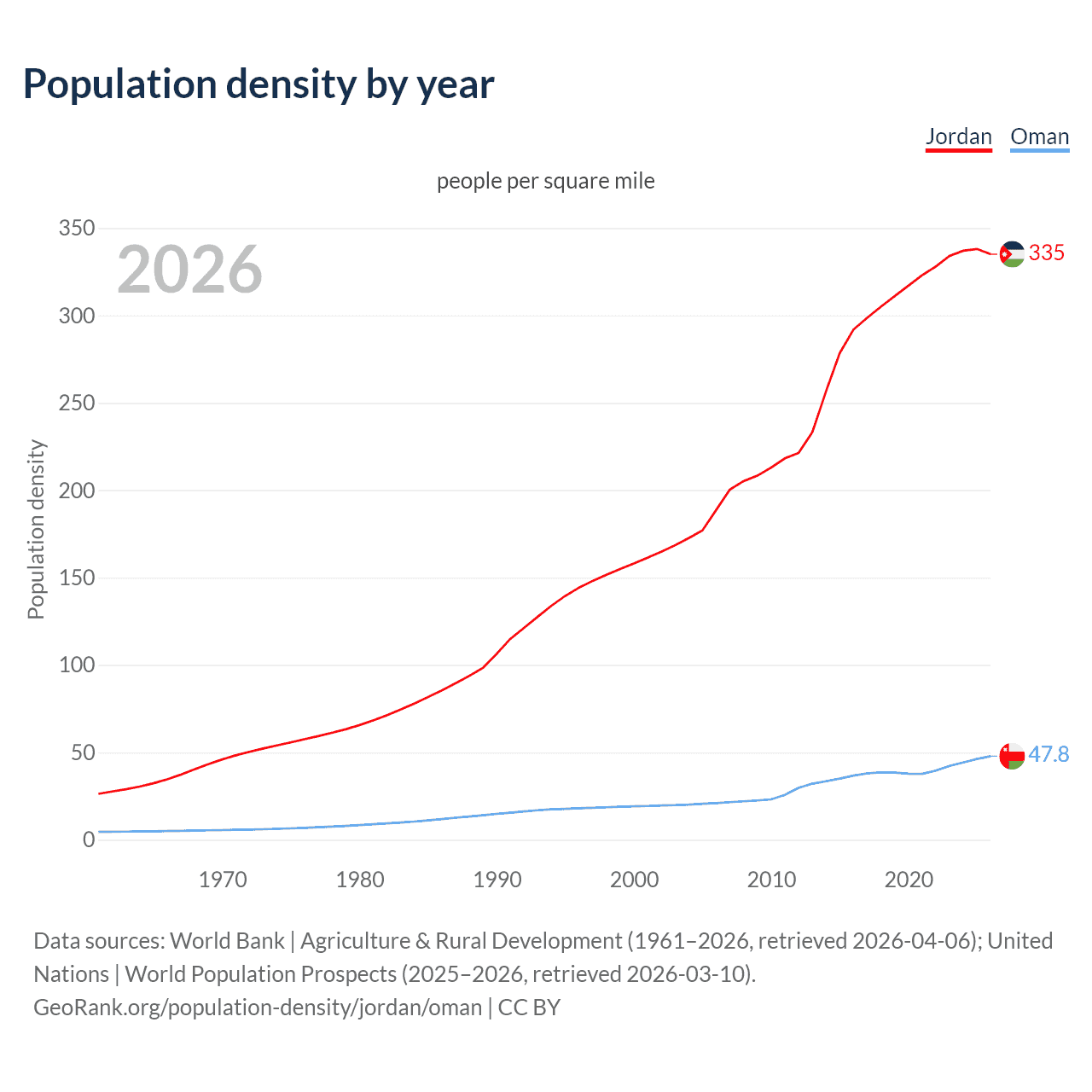 From 2006 to 2026, population density in Jordan increased by 77.6%, compared to a 127.4% growth in Oman.