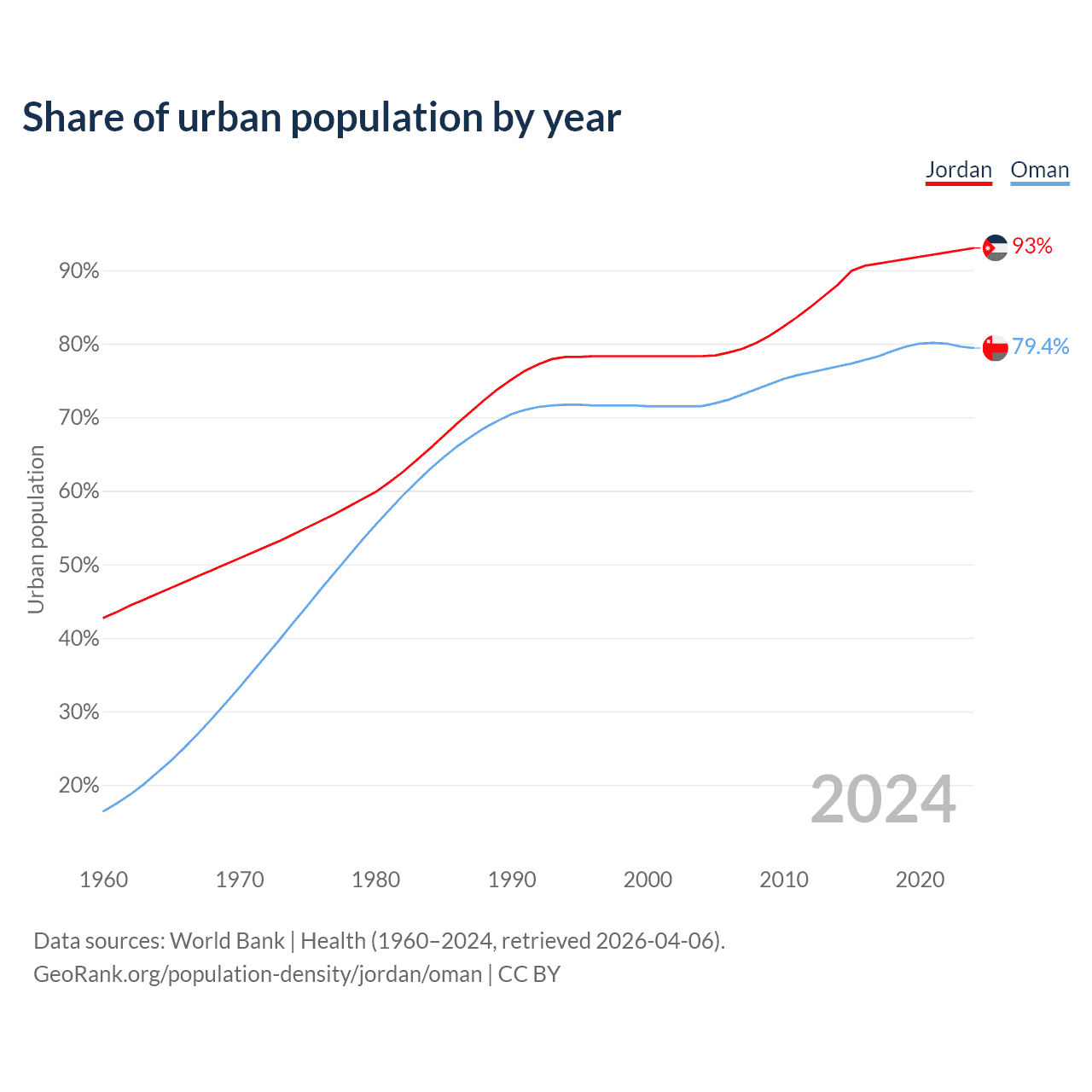 From 2004 to 2024, the share of urban population changed from 78.3% to 93% in Jordan and from 71.5% to 79.4% in Oman.