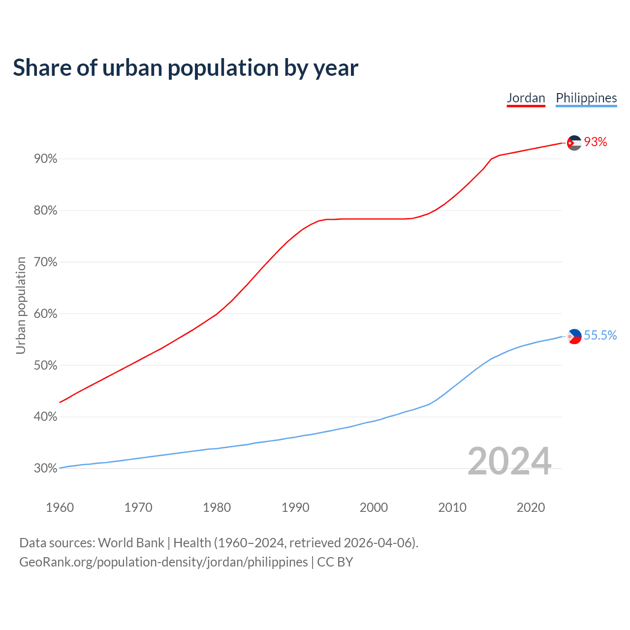 From 2004 to 2024, the share of urban population changed from 78.3% to 93% in Jordan and from 40.9% to 55.5% in the Philippines.