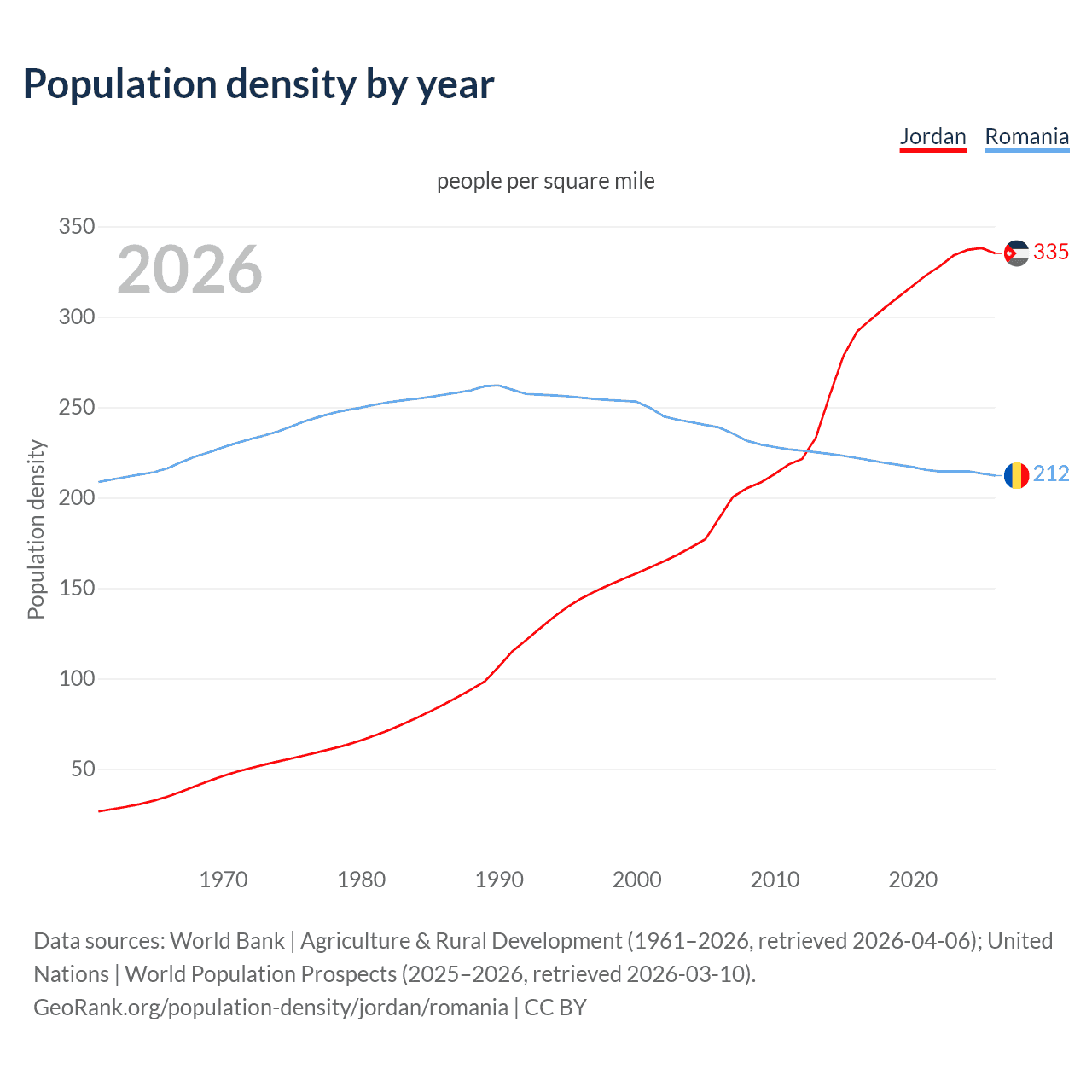 From 2006 to 2026, population density in Jordan increased by 77.6%, compared to a 11.1% decline in Romania.
